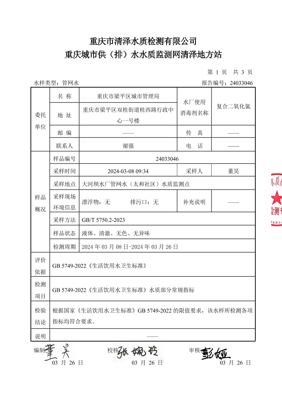 | 标题 | 大河坝水厂管网水(太和社区)2024年3月检测报告 |