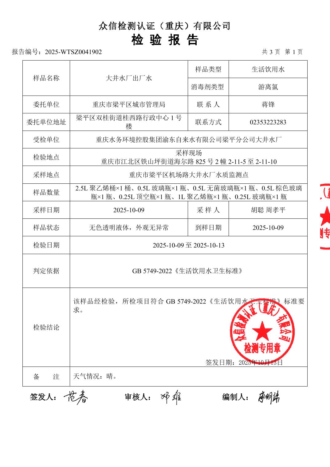 | 标题 | 大井水厂出厂水2025年10月检测报告 |