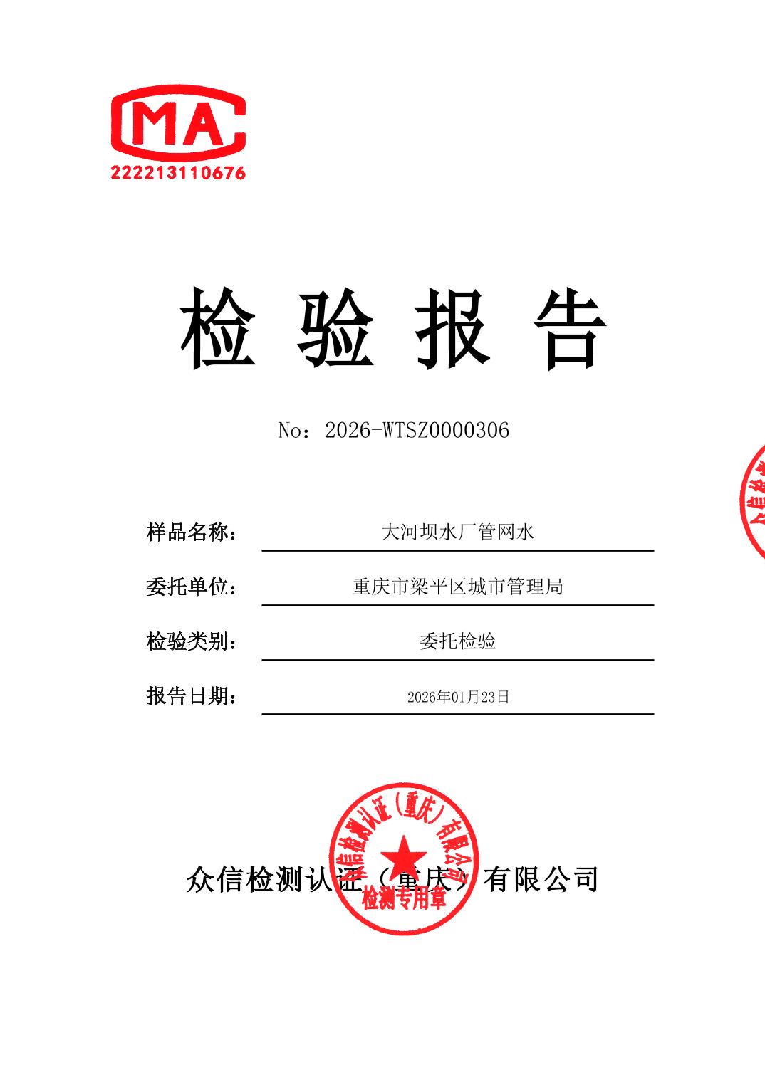 | 标题 | 大河坝水厂管网水2026年1月检测报告 | ||