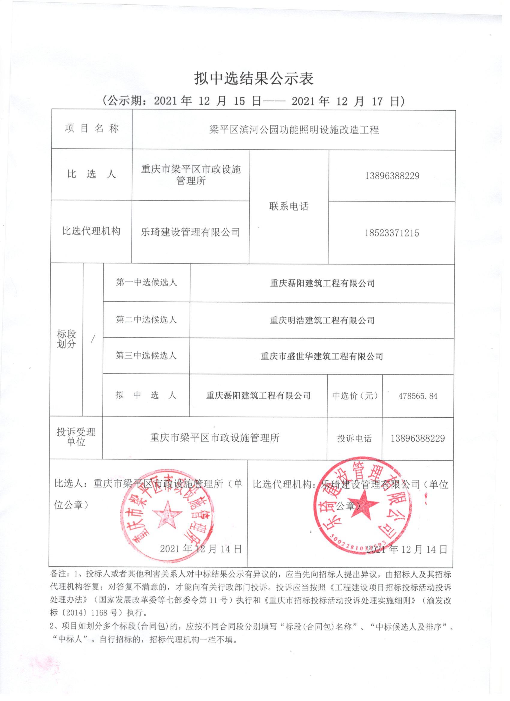 | 标题 | 梁平区滨河公园功能照明设施改造工程拟中标结果公示表 |