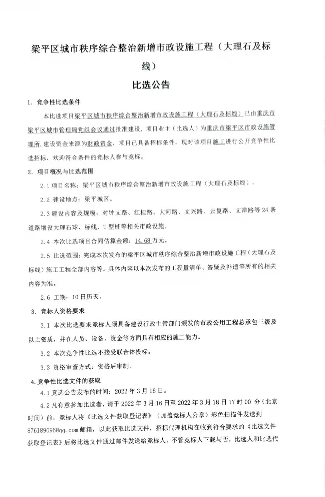 | 标题 | 重庆市梁平区城市秩序综合整治新增市政设施工程(大理石及标线)比选公告 | ||