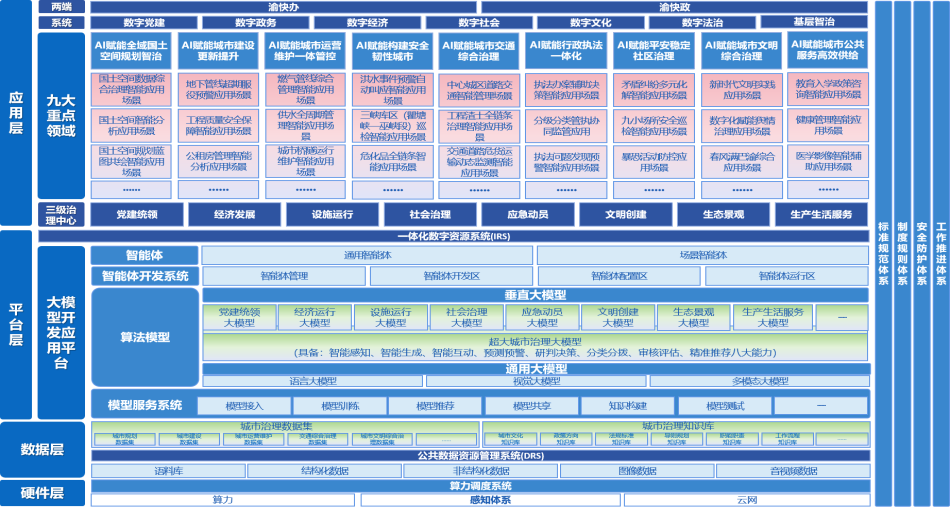 围绕三级治理中心,加强物人融合全域类脑感知系统、多跨协同智能决策处置系统、高效协同算力调度系统、开放共享创新生态系统、安全可靠数据保障系统建设,构建“城市大脑”,支撑超大城市治理大模型开发与AI创新应用。