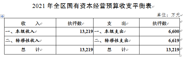 ——全区国有资本经营预算支出6,600万元(全部为区级),调出资金6,619万元,支出总计13,219万元。