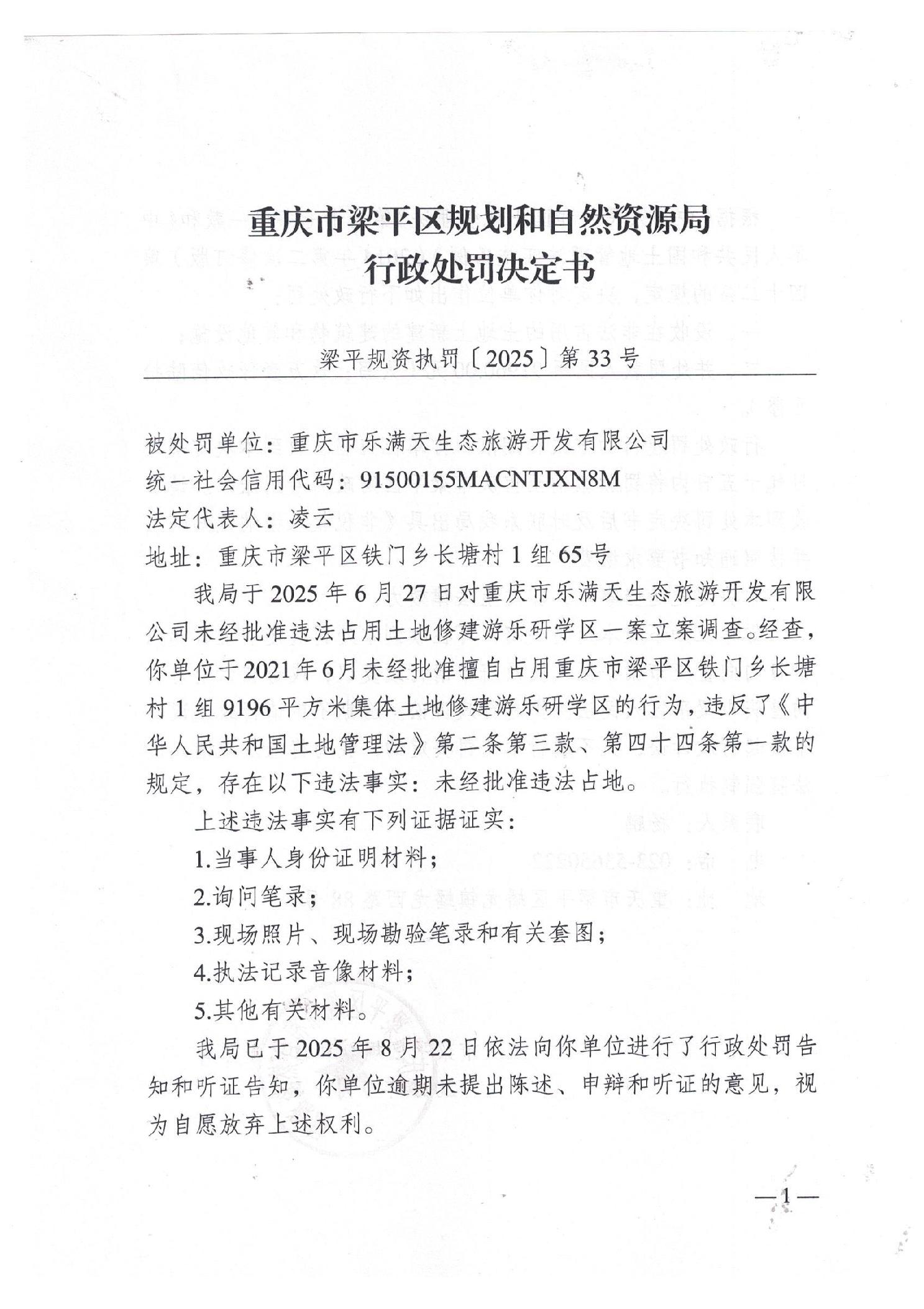 标题 | 重庆市梁平区规划和自然资源局行政处罚决定书(梁平规资执罚[2025]33号) |