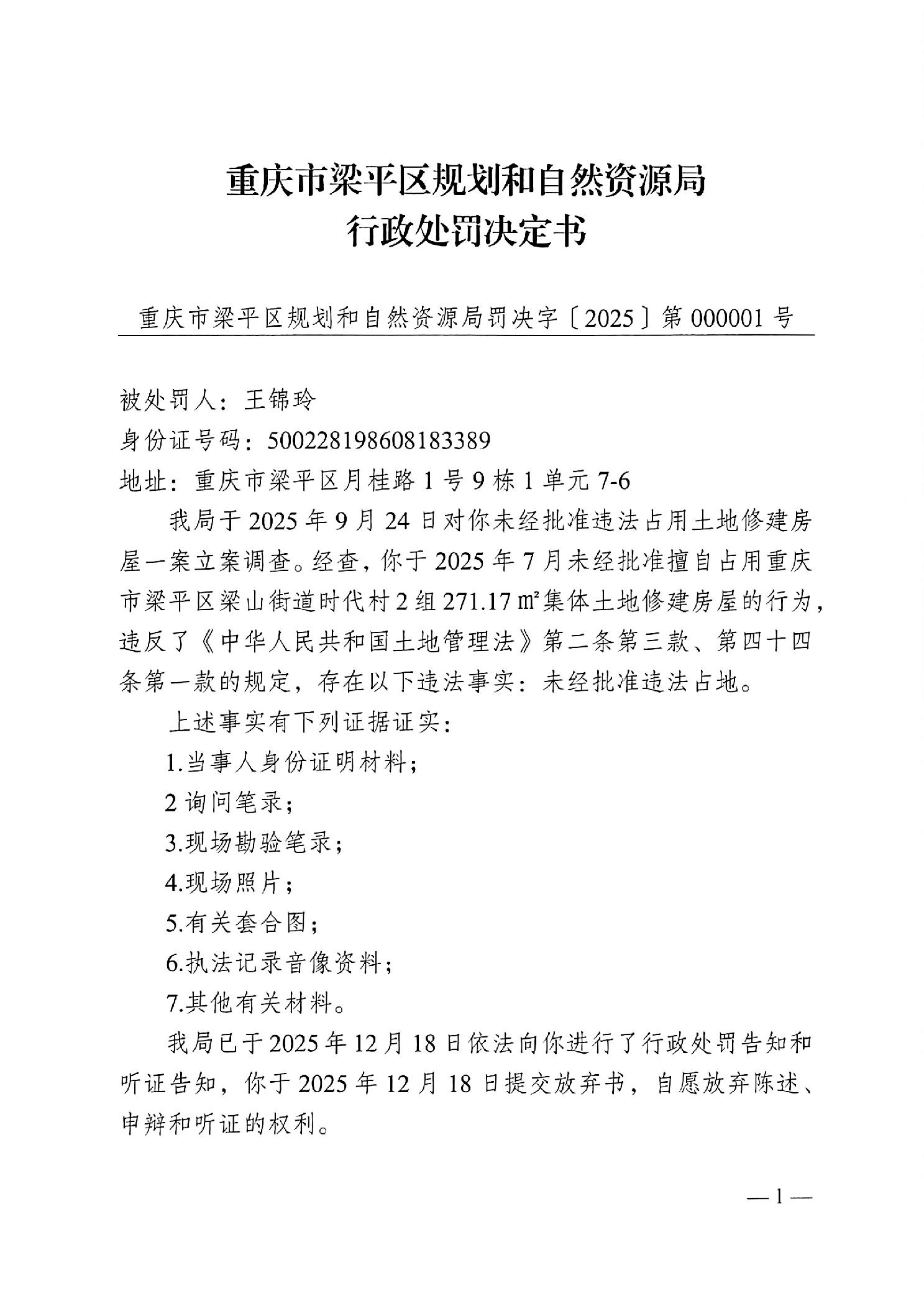 | 标题 | 重庆市梁平区规划和自然资源局行政处罚决定书(梁平规资执罚[2025]000001号) |