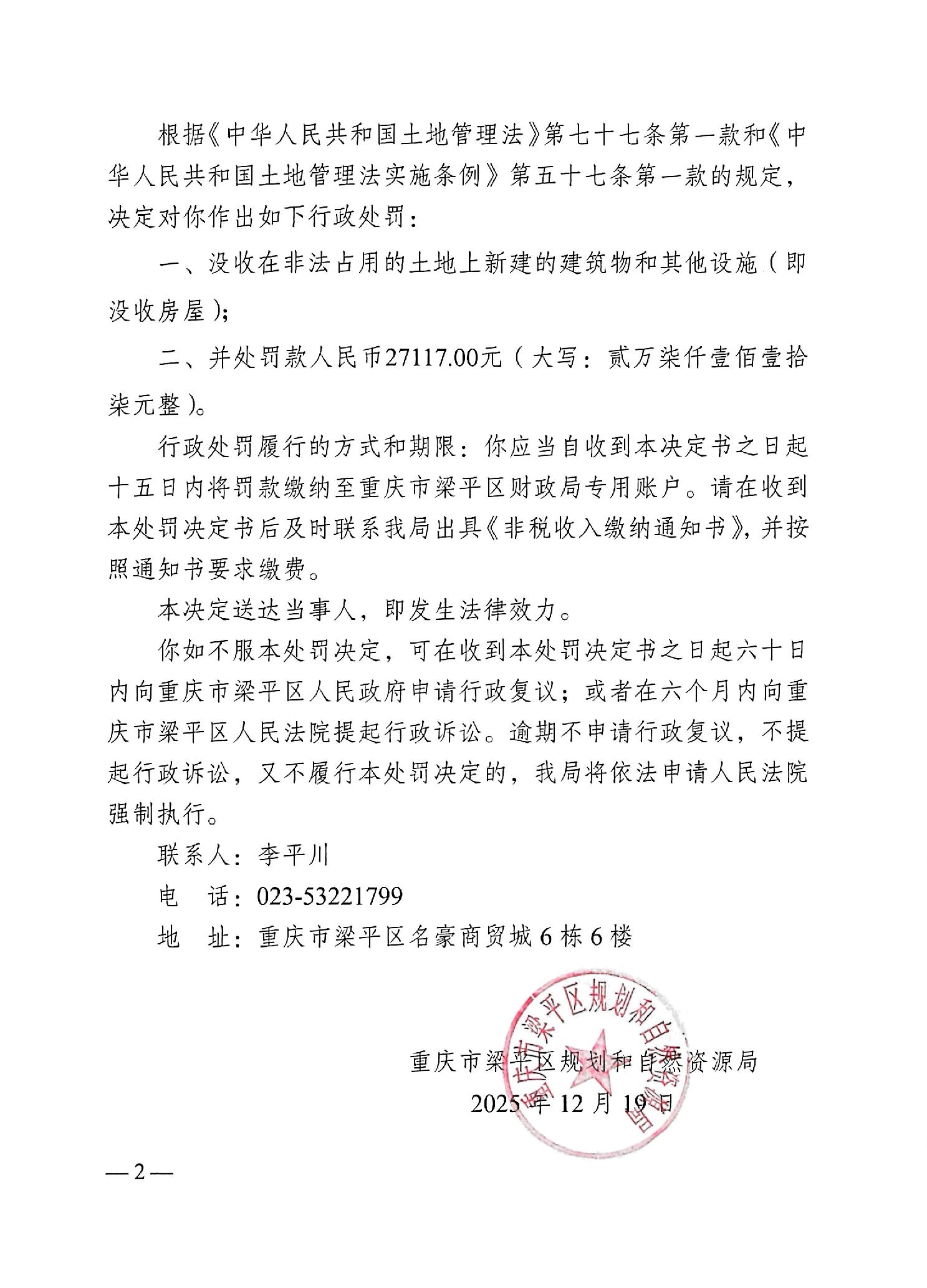 | 标题 | 重庆市梁平区规划和自然资源局行政处罚决定书(梁平规资执罚[2025]000001号) | ||
