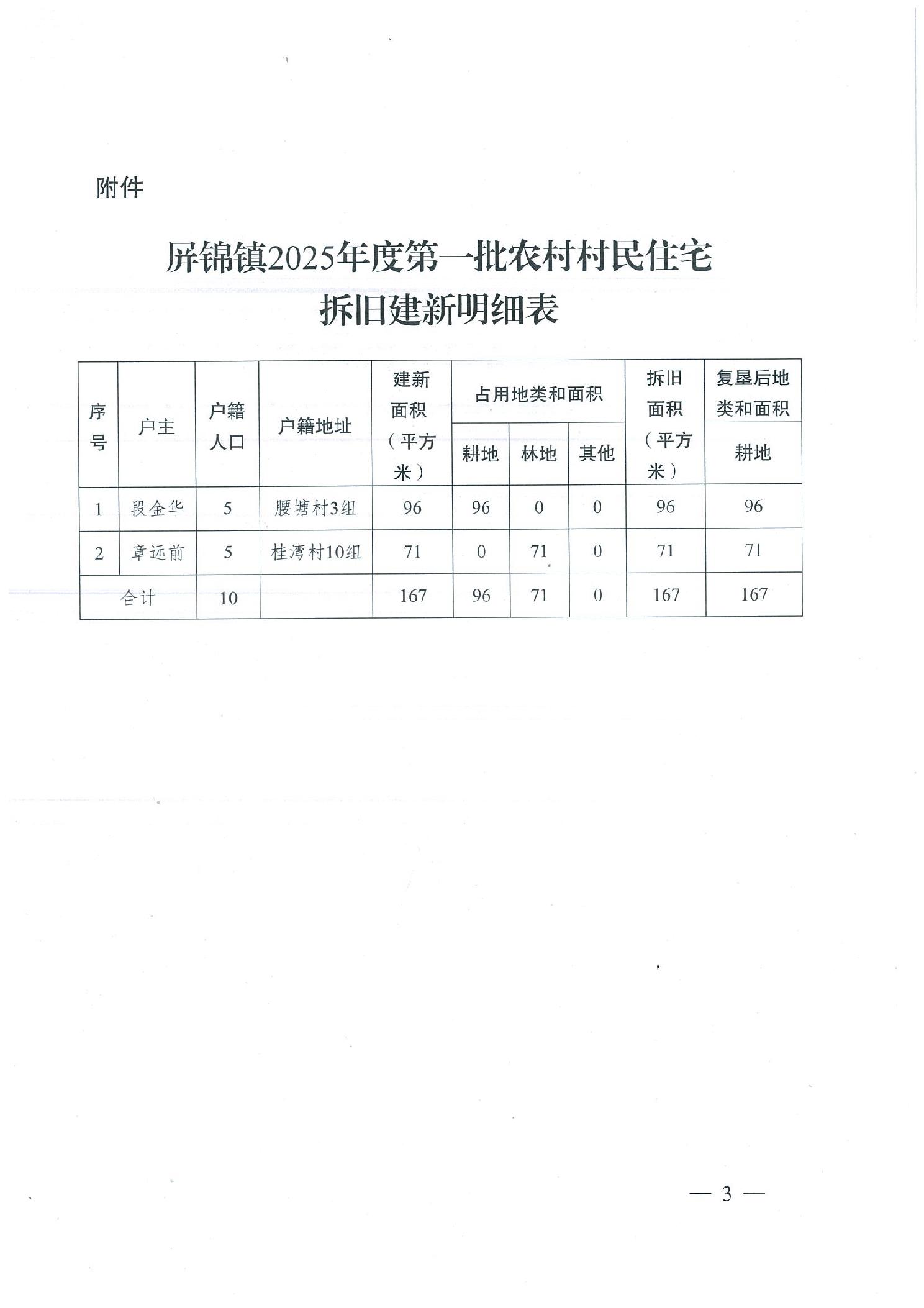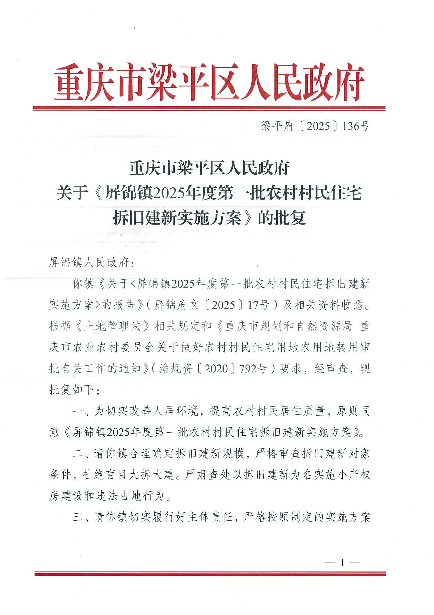 | 标题 | 重庆市梁平区人民政府关于《屏锦镇2025年度第一批农村村民住宅拆旧建新实施方案》的批复 |