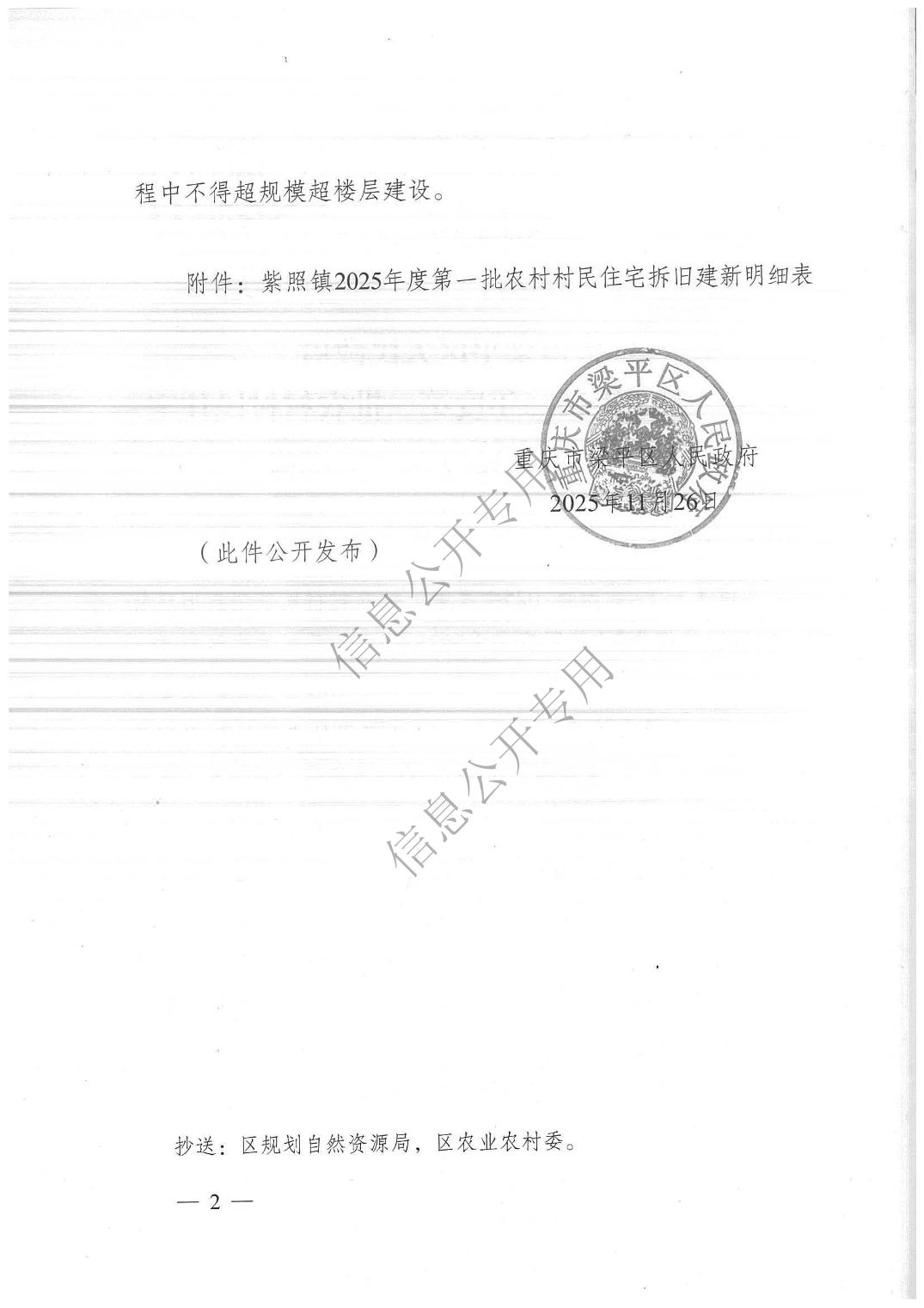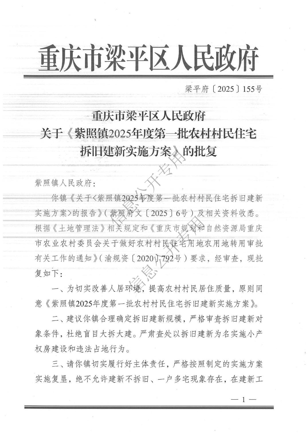 | 标题 | 重庆市梁平区人民政府关于《紫照镇2025年度第一批农村村民住宅拆旧建新实施方案》的批复 |