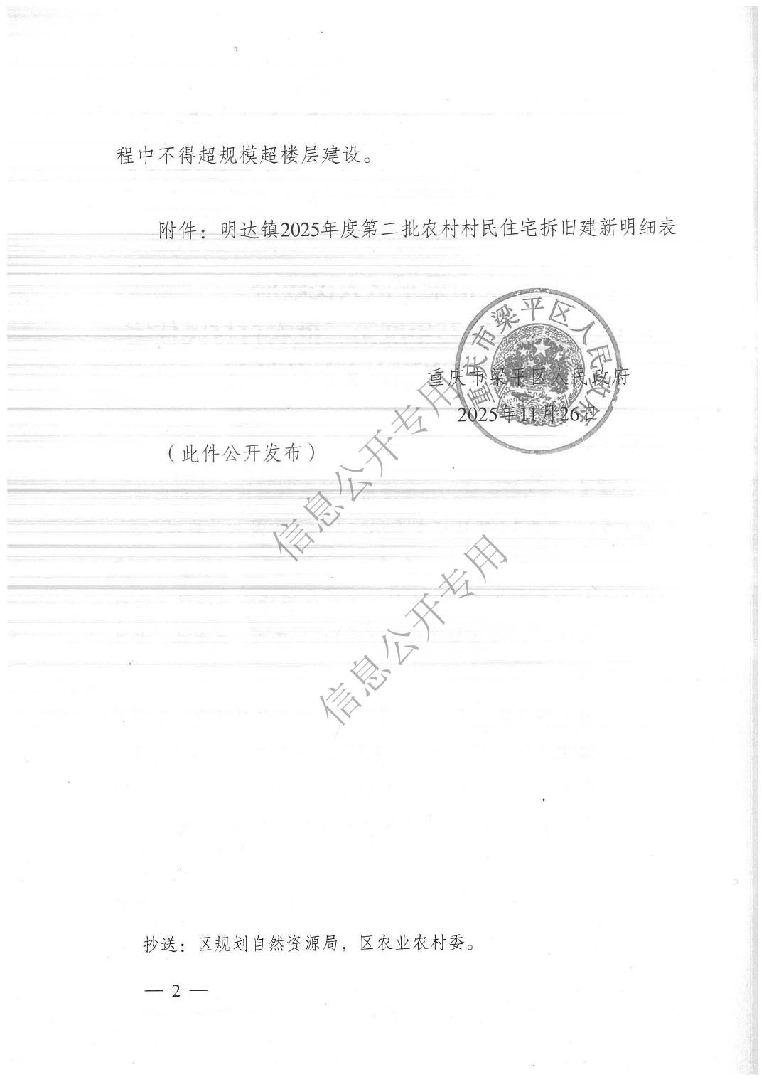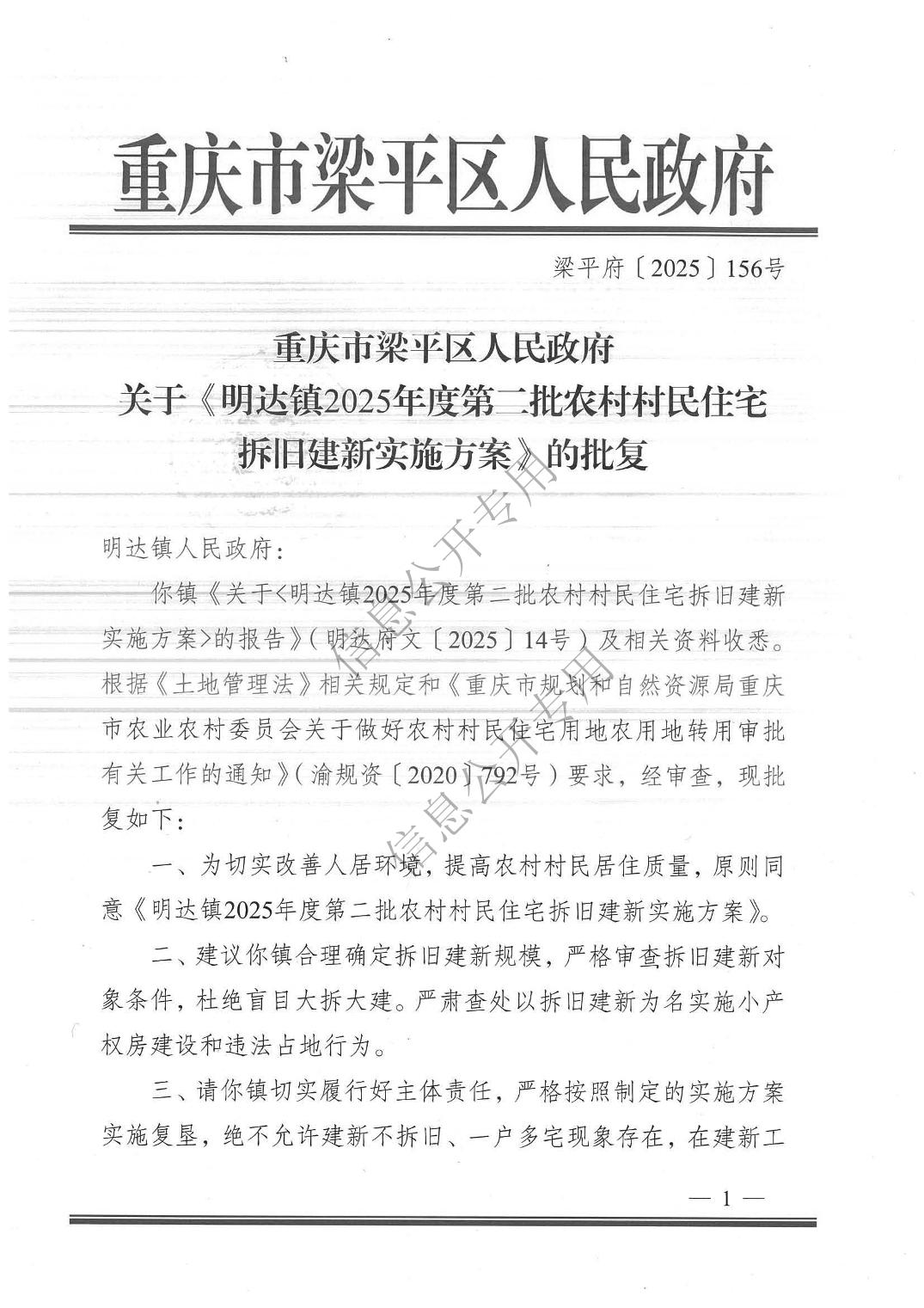 | 标题 | 重庆市梁平区人民政府关于《明达镇2025年度第二批农村村民住宅拆旧建新实施方案》的批复 |