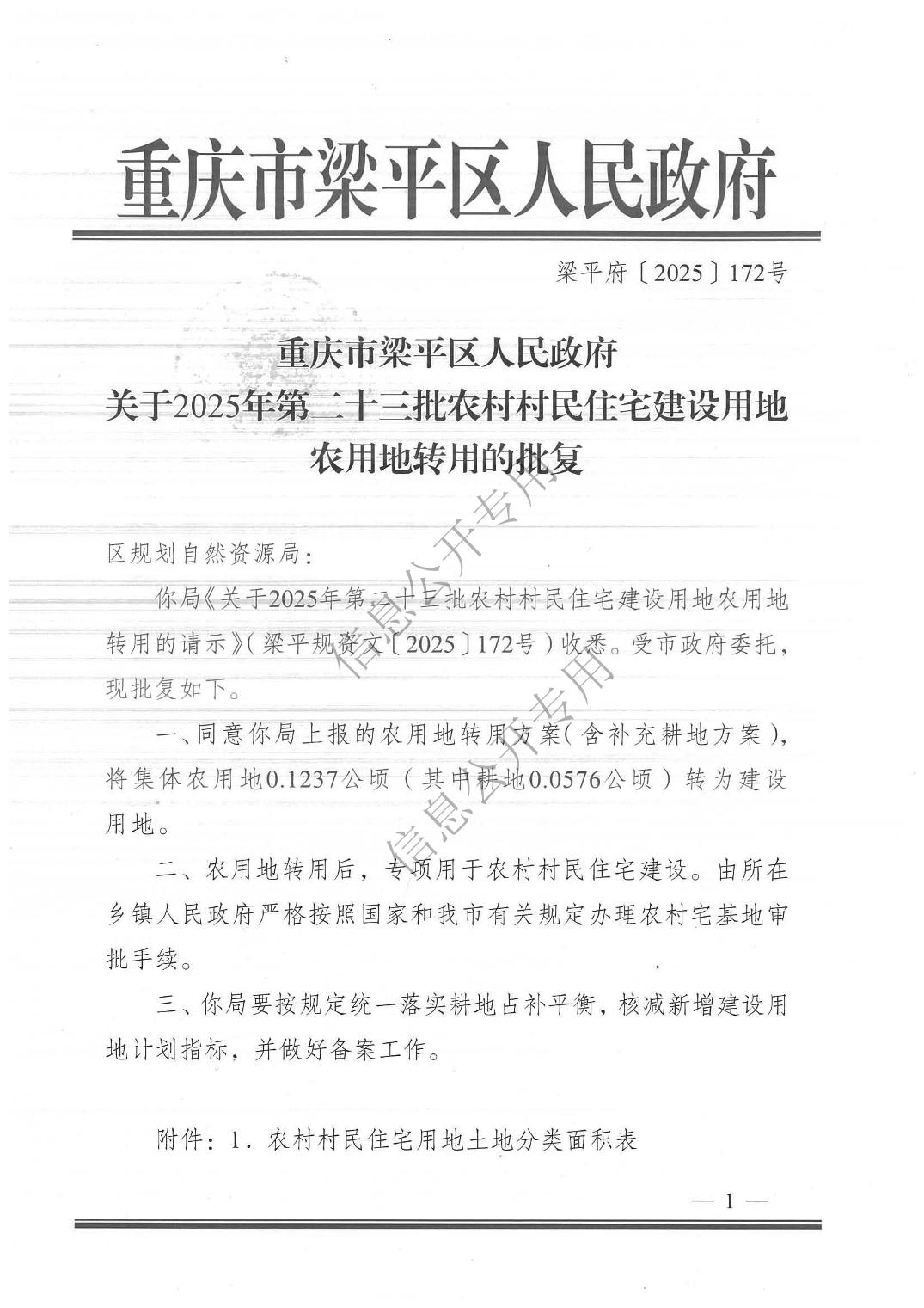 | 标题 | 重庆市梁平区人民政府关于2025年第二十三批农村村民住宅建设用地农用地转用的批复 |
