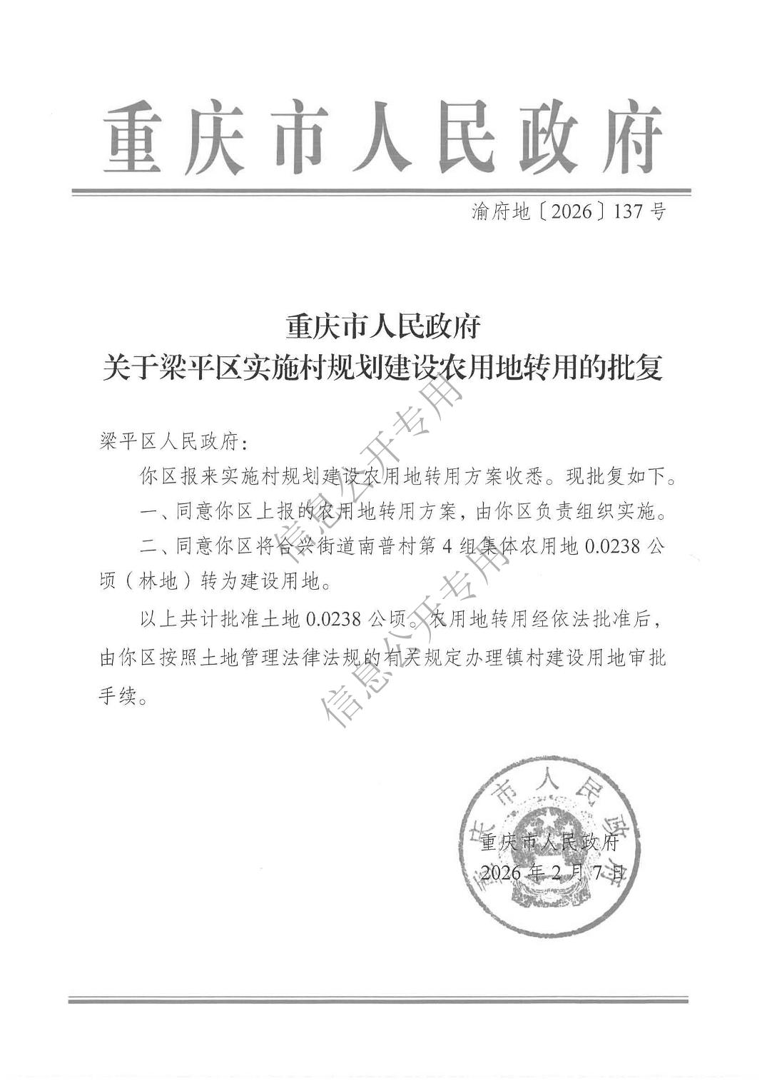 | 标题 | 重庆市人民政府关于梁平区实施村规划建设农用地转用的批复 | ||