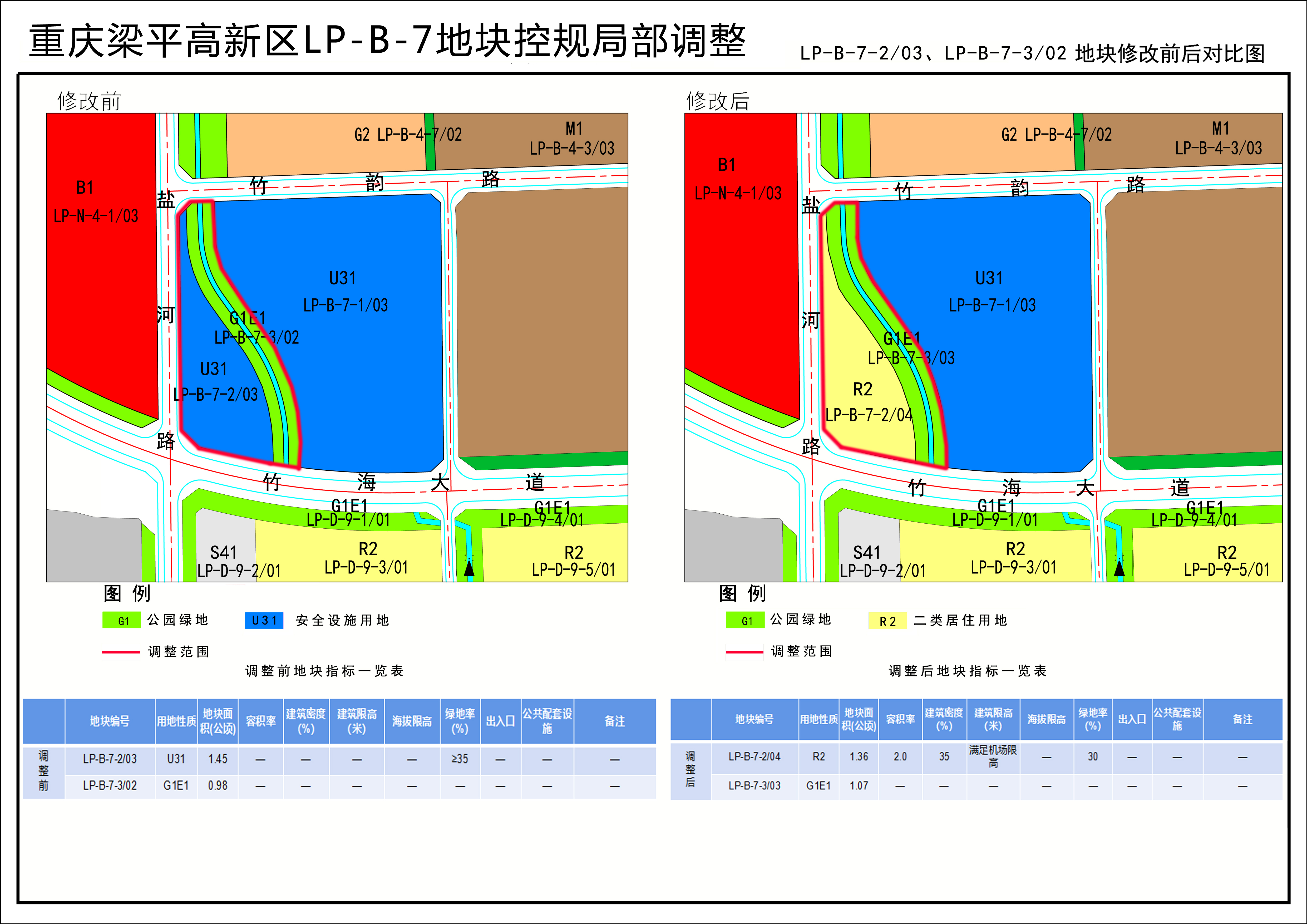 一、LP-B-7-2/03、LP-B-7-3/02地块:将LP-B-7-2/03地块用地性质由消防用地(U31)调整为二类居住用地(R2),调整后地块面积1.36公顷,容积率≤2.0,建筑密度≤35%,绿地率≥30%,建筑限高满足机场限高;优化LP-B-7-3/02地块边界,用地性质保持公园绿地(含水域)不变,调整后地块面积1.07公顷。
