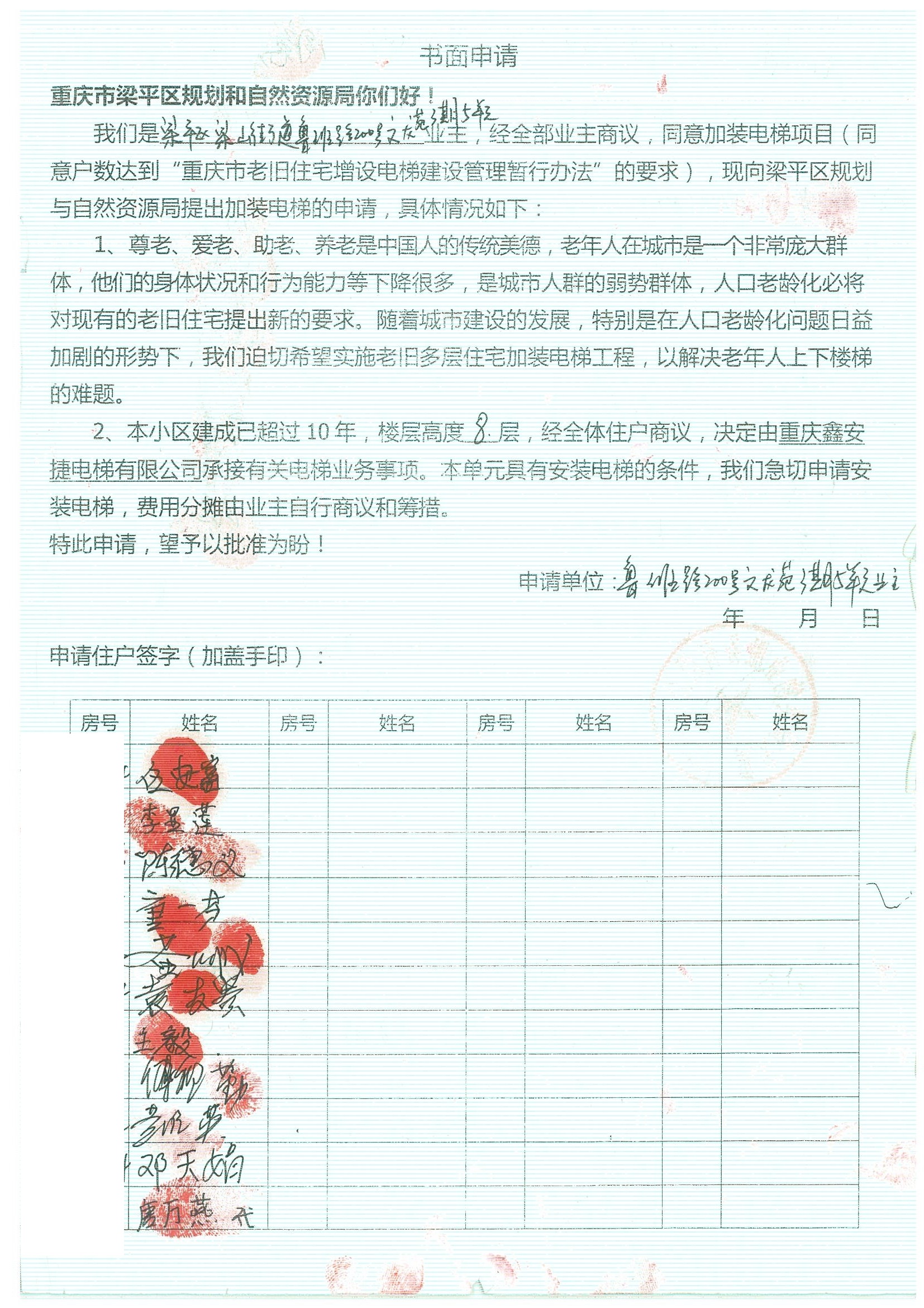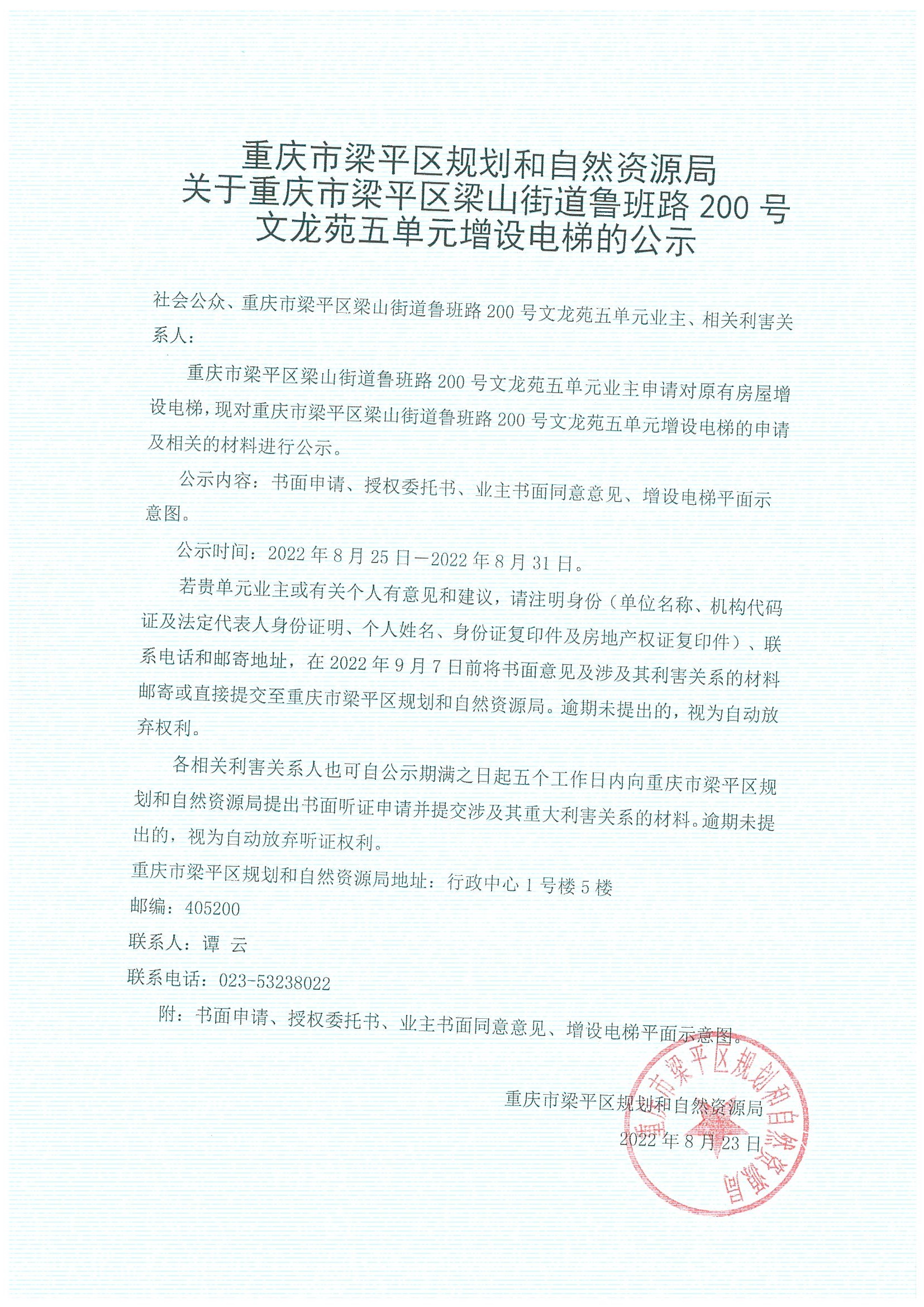 关于重庆市梁平区梁山街道鲁班路200号文龙苑五单元增设电梯的公示