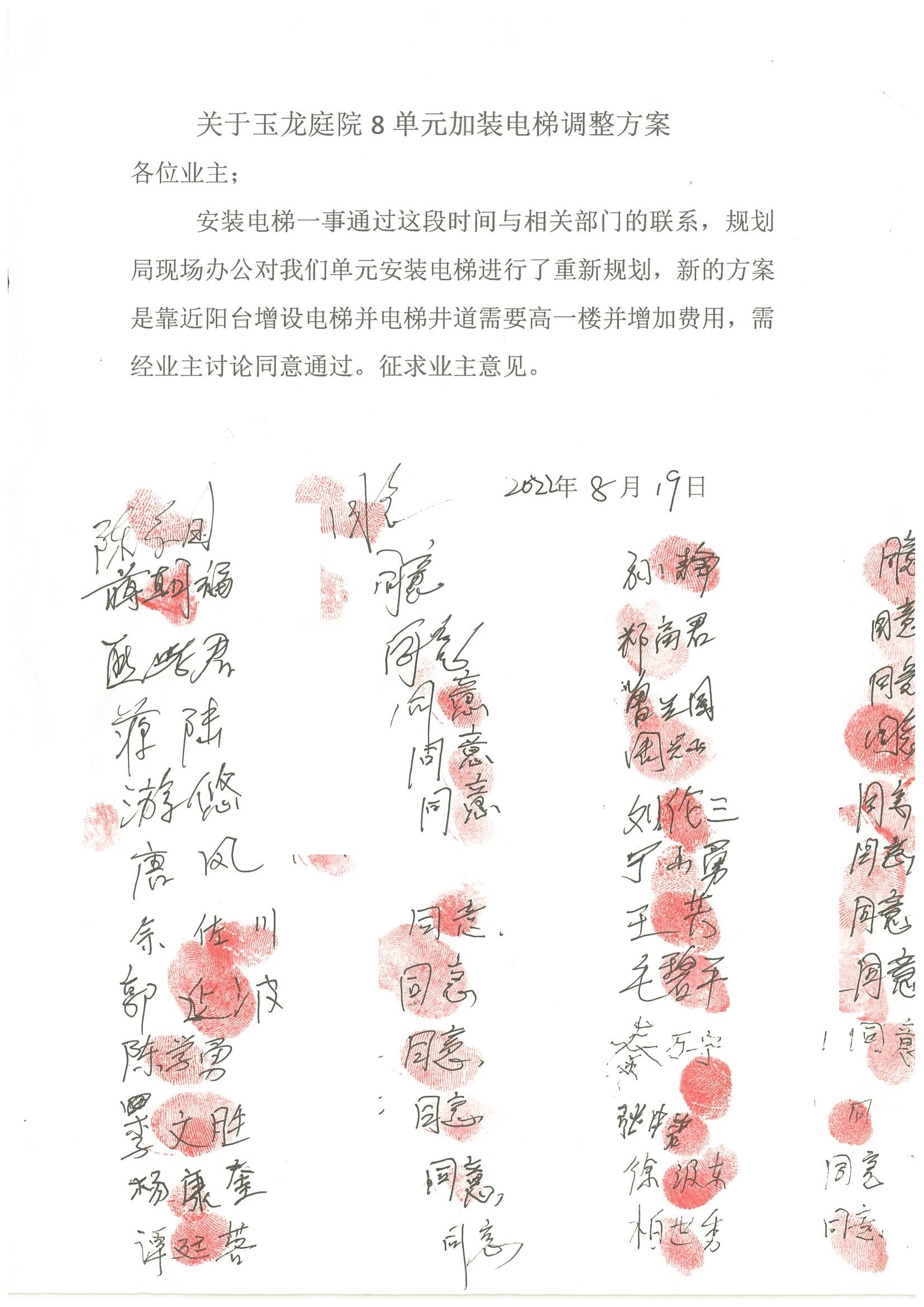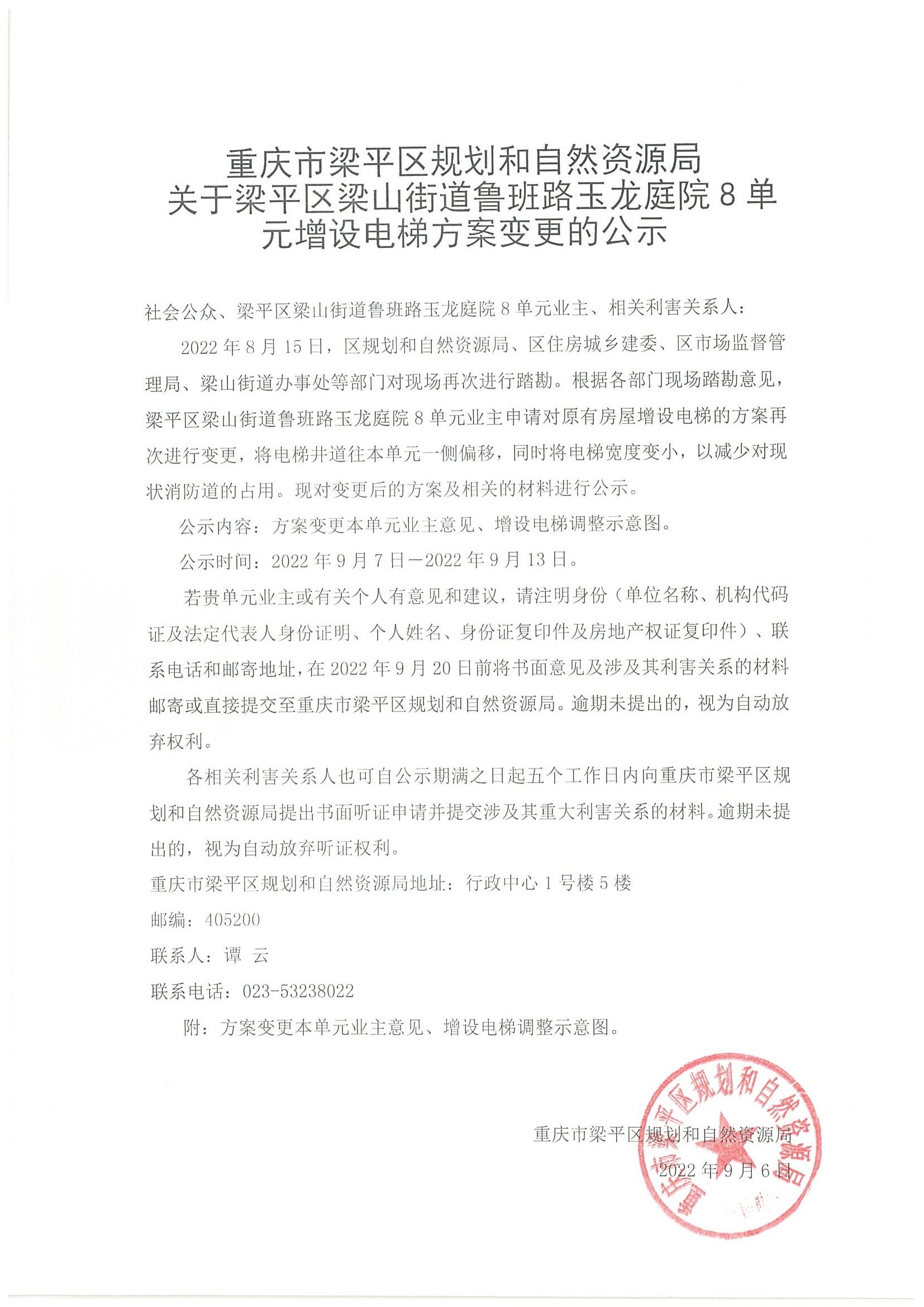 关于梁平区梁山街道鲁班路玉龙庭院8单元增设电梯方案变更的公示