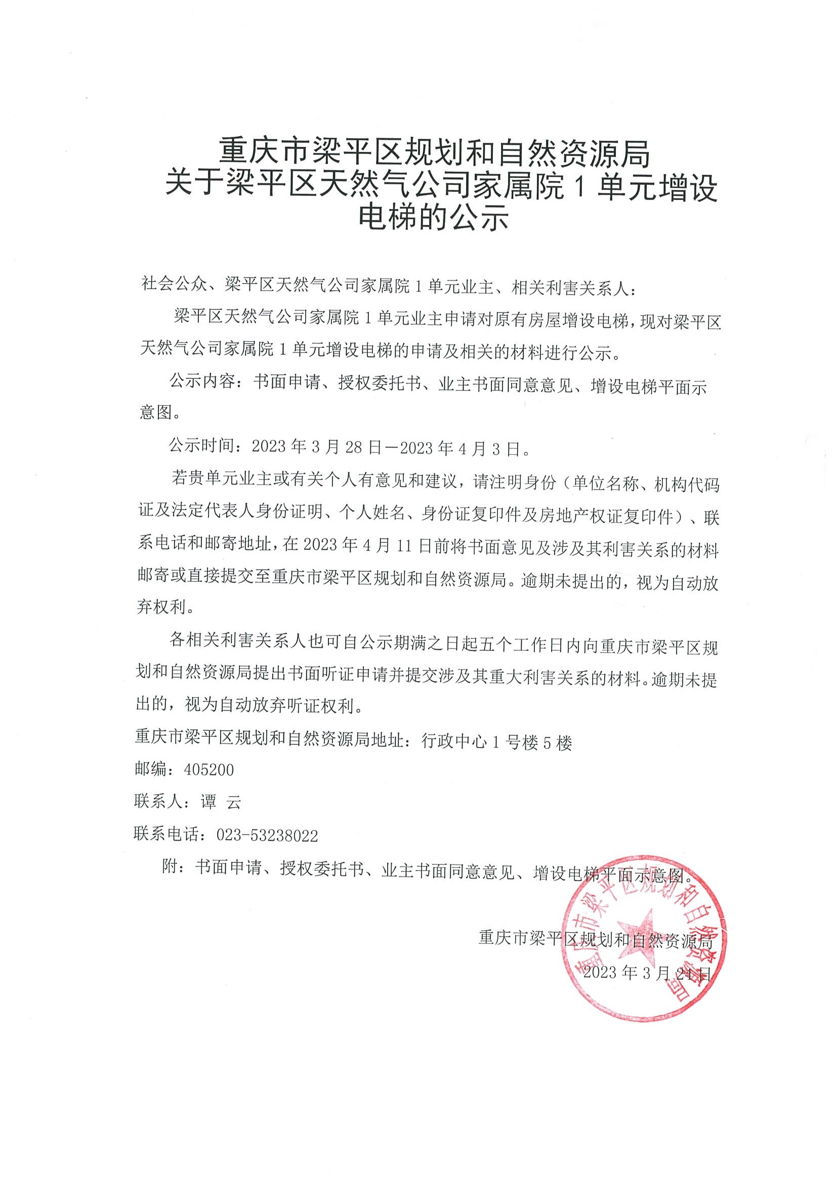 重庆市梁平区规划和自然资源局关于梁平区天然气公司家属院1单元增设电梯的公示