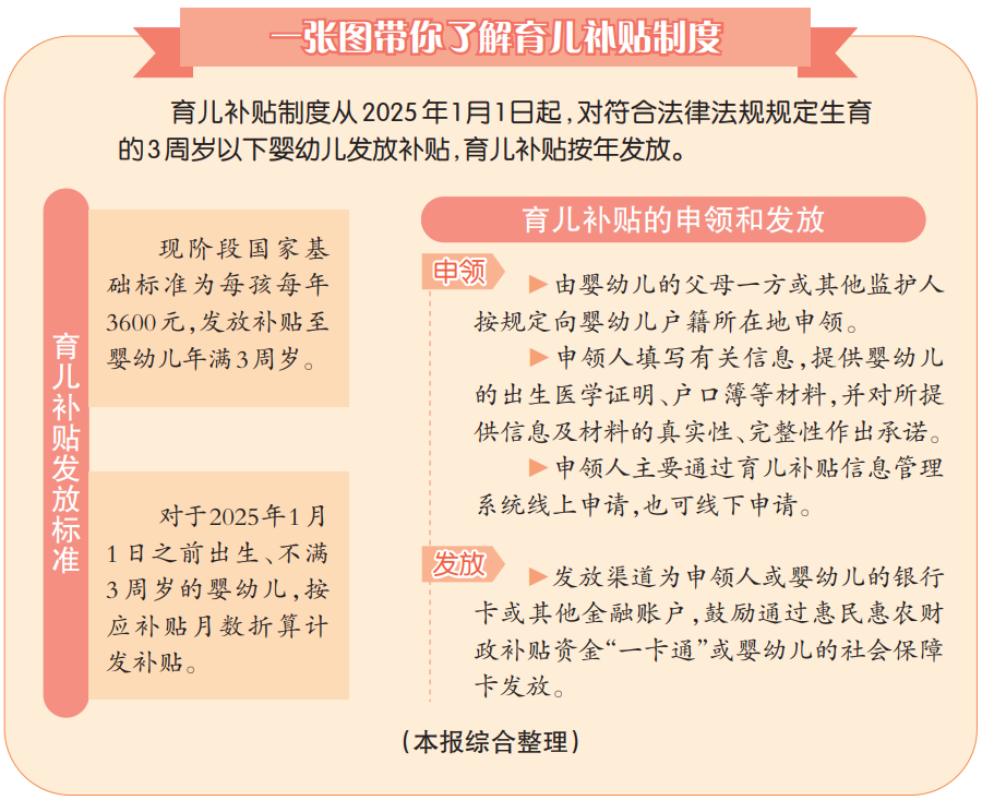 据了解,此次发放育儿补贴,是根据中共中央办公厅、国务院办公厅印发的《育儿补贴制度实施方案》的统一部署。方案规定,自2025年1月1日起,对符合法律法规规定生育的3周岁以下婴幼儿发放补贴,直至其年满3周岁。补贴按年度计算,标准为每孩每年3600元。其中,对2025年1月1日之前出生、不满3周岁的婴幼儿,按应补贴月数折算计发补贴。