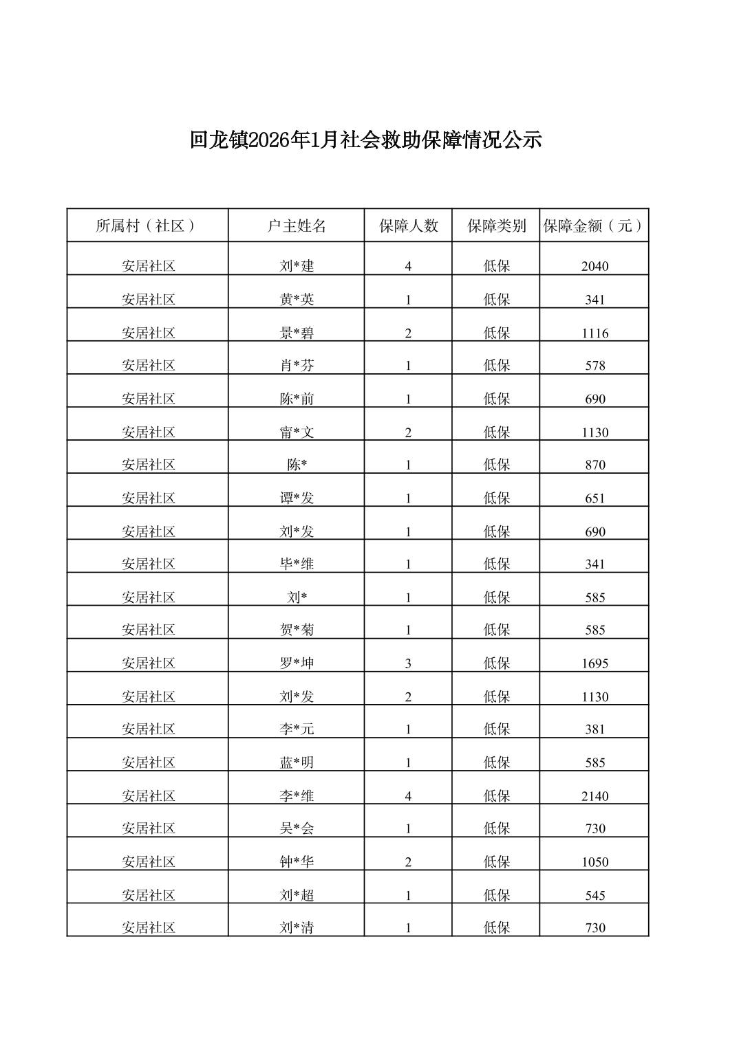 | 标题 | 回龙镇2026年1月社会救助保障情况公示 |