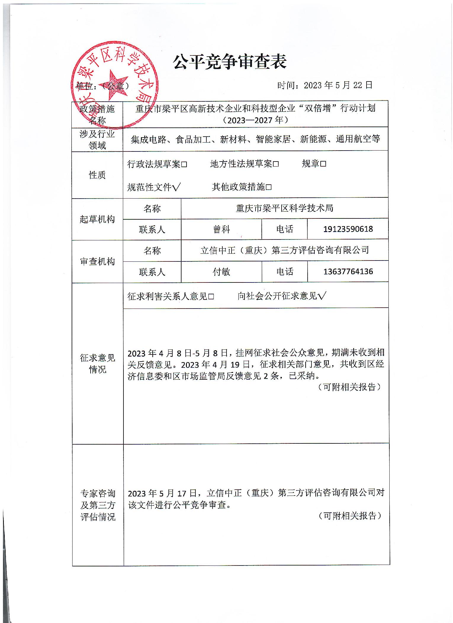 | 标题 | 重庆市梁平区高新技术企业和科技型企业“双倍增”行动计划(2023-2027年)公平竞争审查表 |