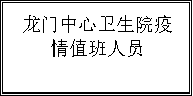 龙门镇中心卫生院:负责疫区内人员防护的技术指导,高危人群的预防和医学观察、人间疫情监测工作;组织实施人间人畜共患传染病防治;负责组织疫点、疫区、受威胁区内人员的疫情监测和病人的诊治工作;人畜共患传染病在人群中发生时,及时将疫情报镇人民政府和区卫生健康委,并通报区农委,及时采取有关防控措施。
