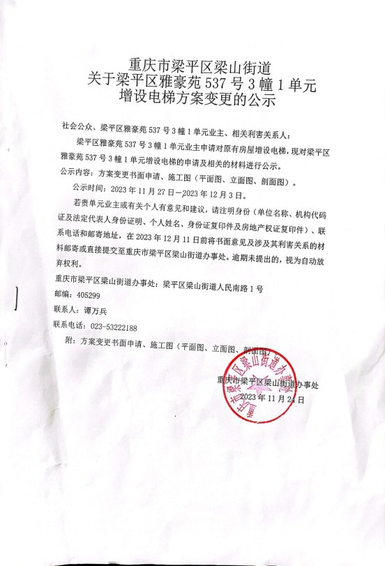 | 标题 | 重庆市梁平区梁山街道办事处关于雅豪苑537号3幢1单元增设电梯方案变更的公示 |
