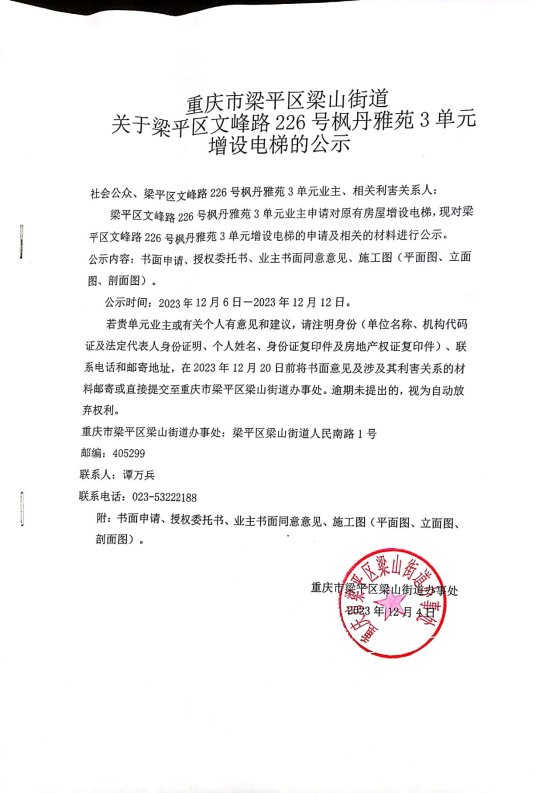 | 标题 | 重庆市梁平区梁山街道办事处关于文峰路226号枫丹雅苑3单元增设电梯的公示 |