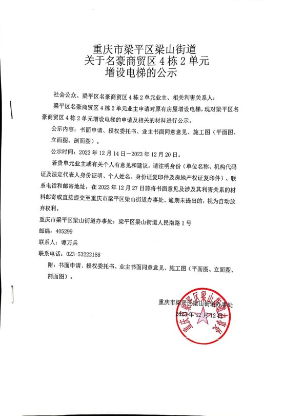 | 标题 | 重庆市梁平区梁山街道办事处关于名豪商贸区4栋2单元增设电梯的公示 |