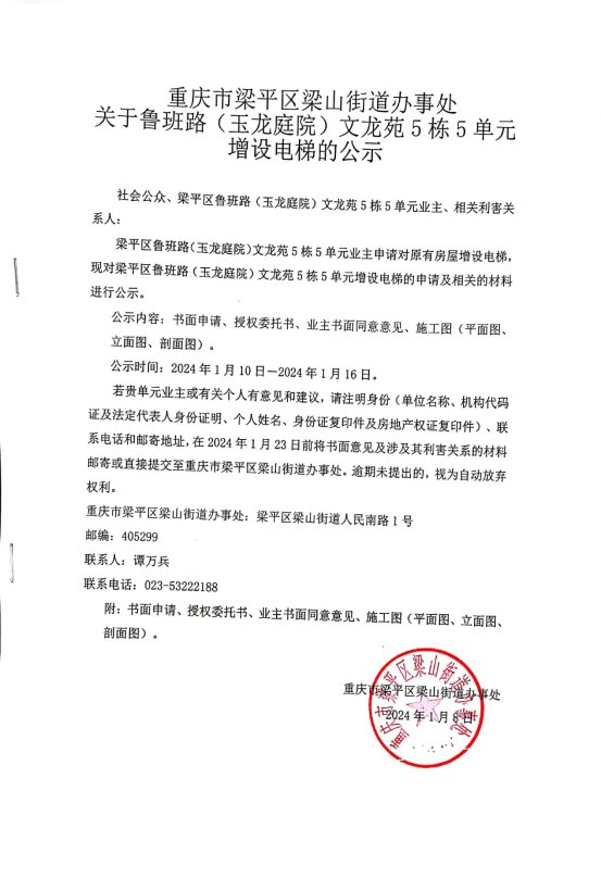 | 标题 | 重庆市梁平区梁山街道办事处关于鲁班路(玉龙庭院)文龙苑5栋5单元增设电梯的公示 | ||