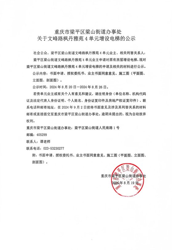 | 标题 | 重庆市梁平区梁山街道办事处关于文峰路枫丹雅苑4单元增设电梯的公示 |