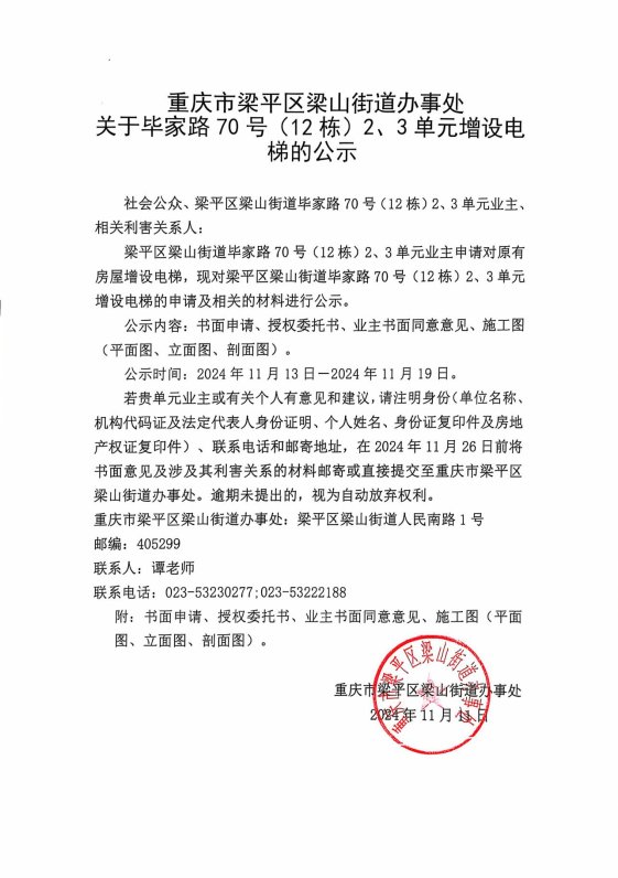 | 标题 | 重庆市梁平区梁山街道办事处关于毕家路70号(12栋)2、3单元增设电梯的公示 |