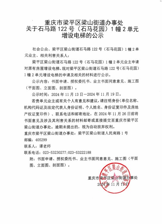 | 标题 | 重庆市梁平区梁山街道办事处关于石马路122号(石马花园)1幢2单元增设电梯的公示 |