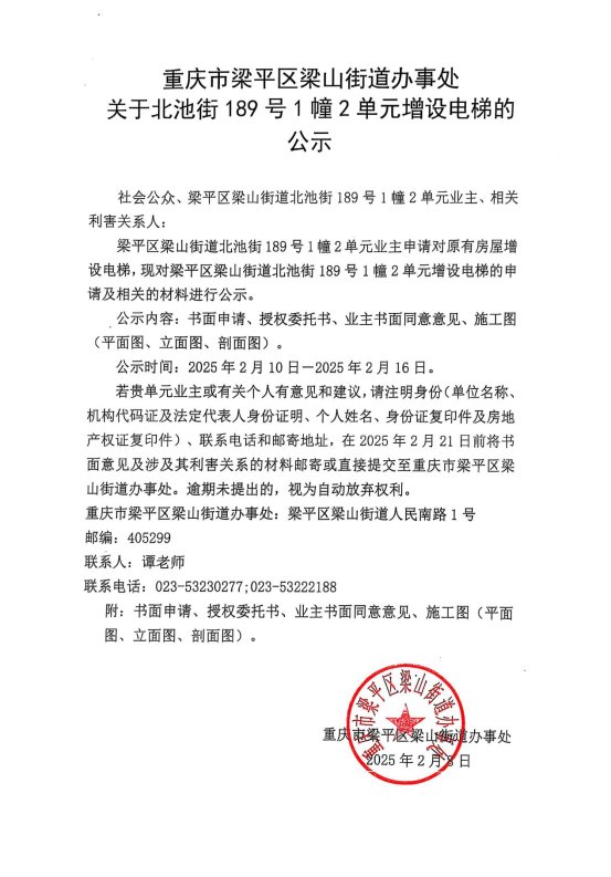 | 标题 | 重庆市梁平区梁山街道办事处关于北池街189号1幢2单元增设电梯的公示 | ||