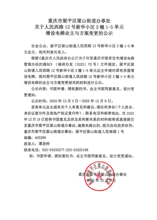 | 标题 | 重庆市梁平区梁山街道办事处关于人民西路12号新华小区2幢1-5单元增设电梯业主与方案变更的公示 |