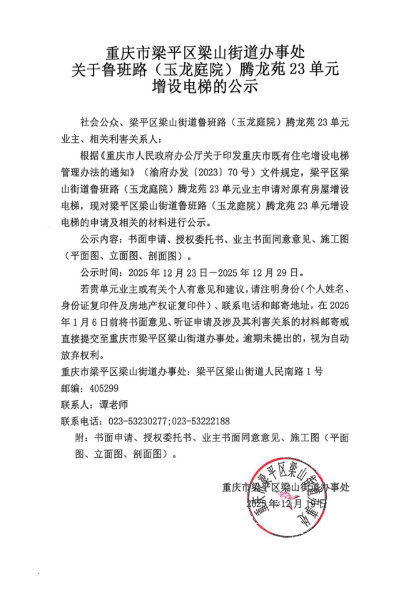 | 标题 | 重庆市梁平区梁山街道办事处关于鲁班路(玉龙庭院)腾龙苑23单元增设电梯的公示 | ||