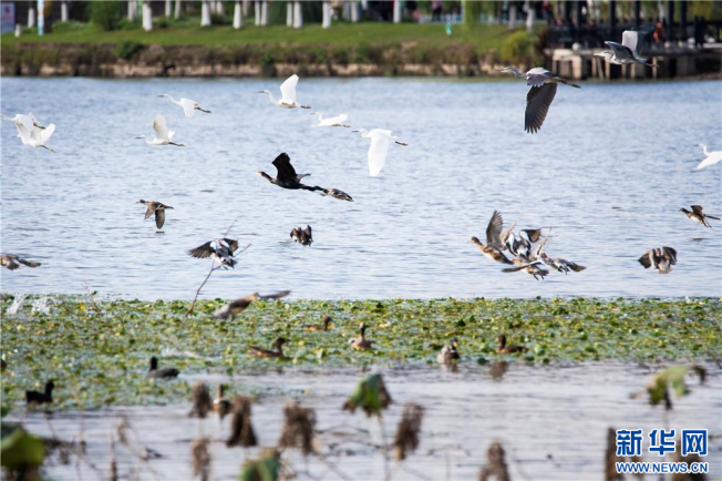 双桂湖国家湿地公园成为候鸟栖息的宜居家园。新华网发(高柔 摄)