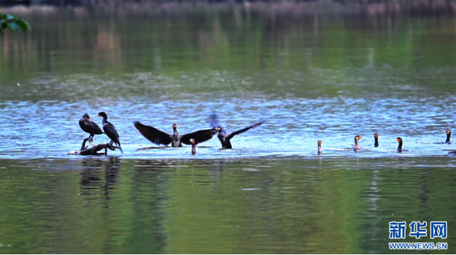 鸬鹚在水面嬉戏,冬日双桂湖充满生机。新华网发(吴梦雄 摄)