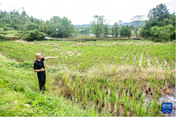 9月26日,重庆市梁平区湿地保护中心工作人员余先怀在双桂湖国家湿地公园内查看稻田情况。公园内耕种了450亩环湖水稻田,这是冬候鸟的食物来源之一。