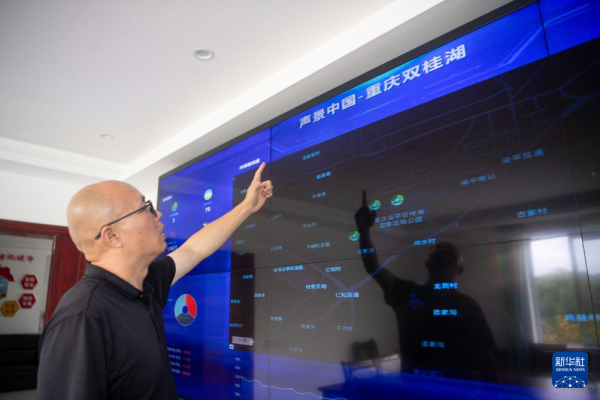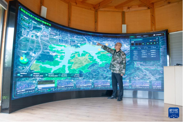 9月26日,重庆市梁平区湿地保护中心工作人员余先怀在双桂湖国家湿地公园内介绍鸟类AI监测大数据平台。
