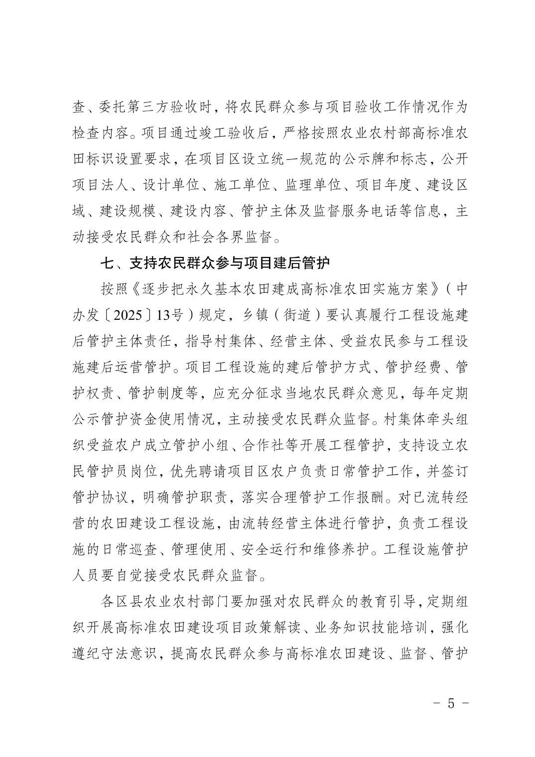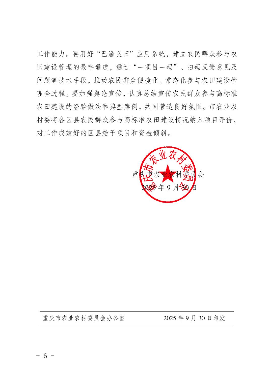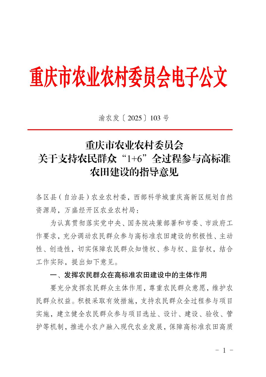 | 标题 | 重庆市农业农村委员会关于支持农民群众“1+6”全过程参与高标准农田建设的意见 |