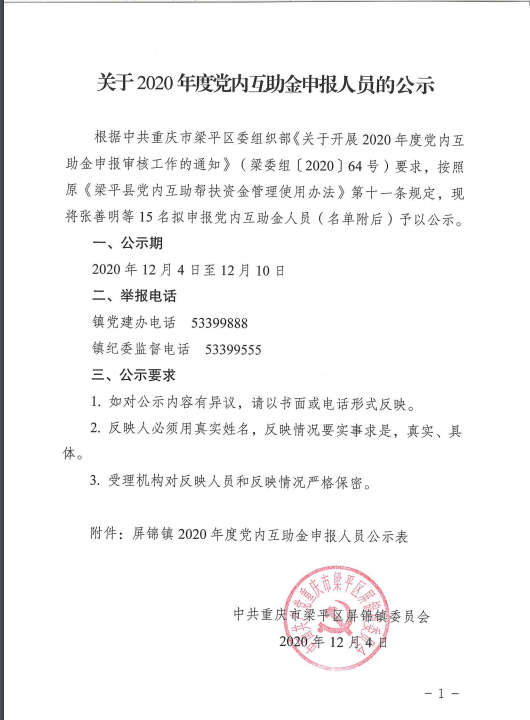 根据中共重庆市梁平区委组织部《关于开展2020年度党内互助金申报审核工作的通知》(梁委组〔2020〕64号)要求,按照原《梁平县党内互助帮扶资金管理使用办法》第十一条规定,现将张善明等15名拟申报党内互助金人员(名单附后)予以公示。