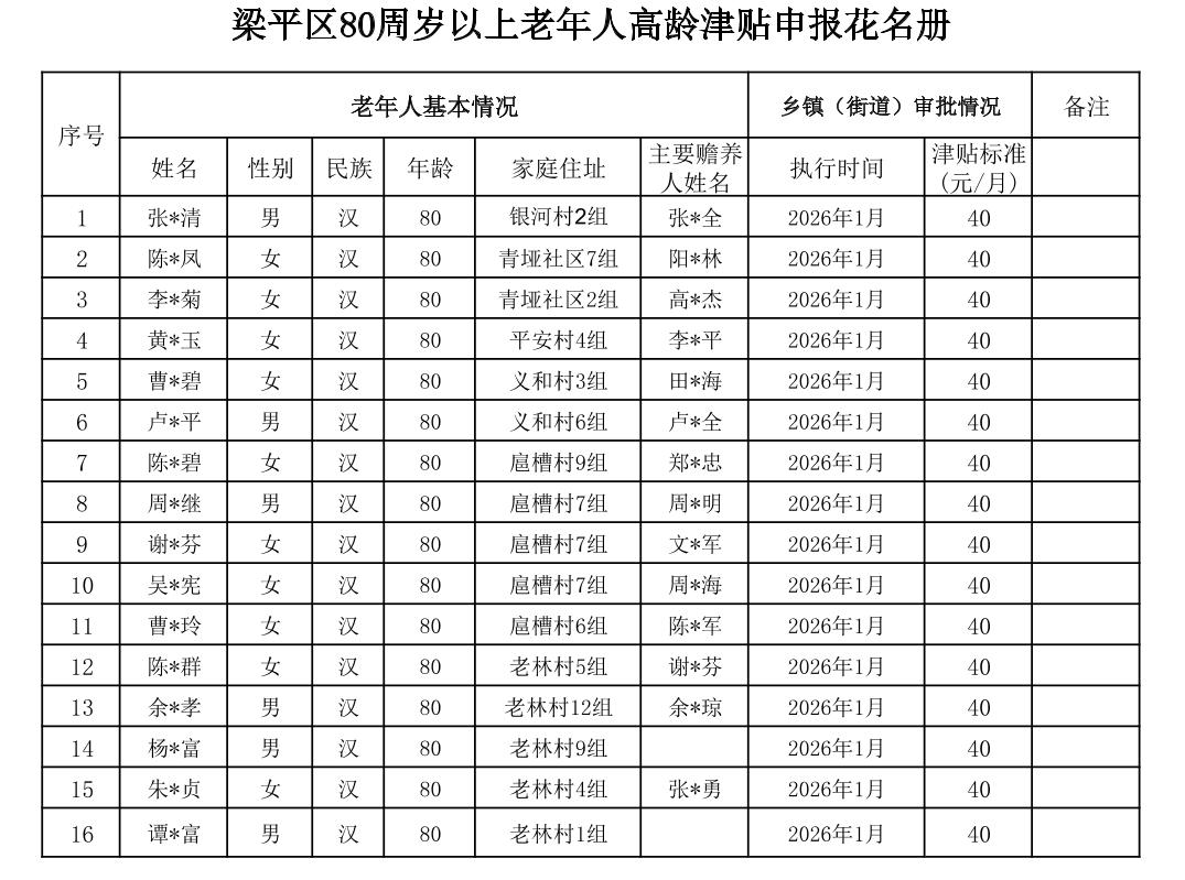 | 标题 | 蟠龙镇2026年1月80周岁以上高龄津贴初审名单 |