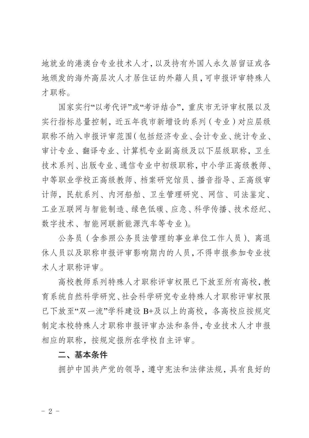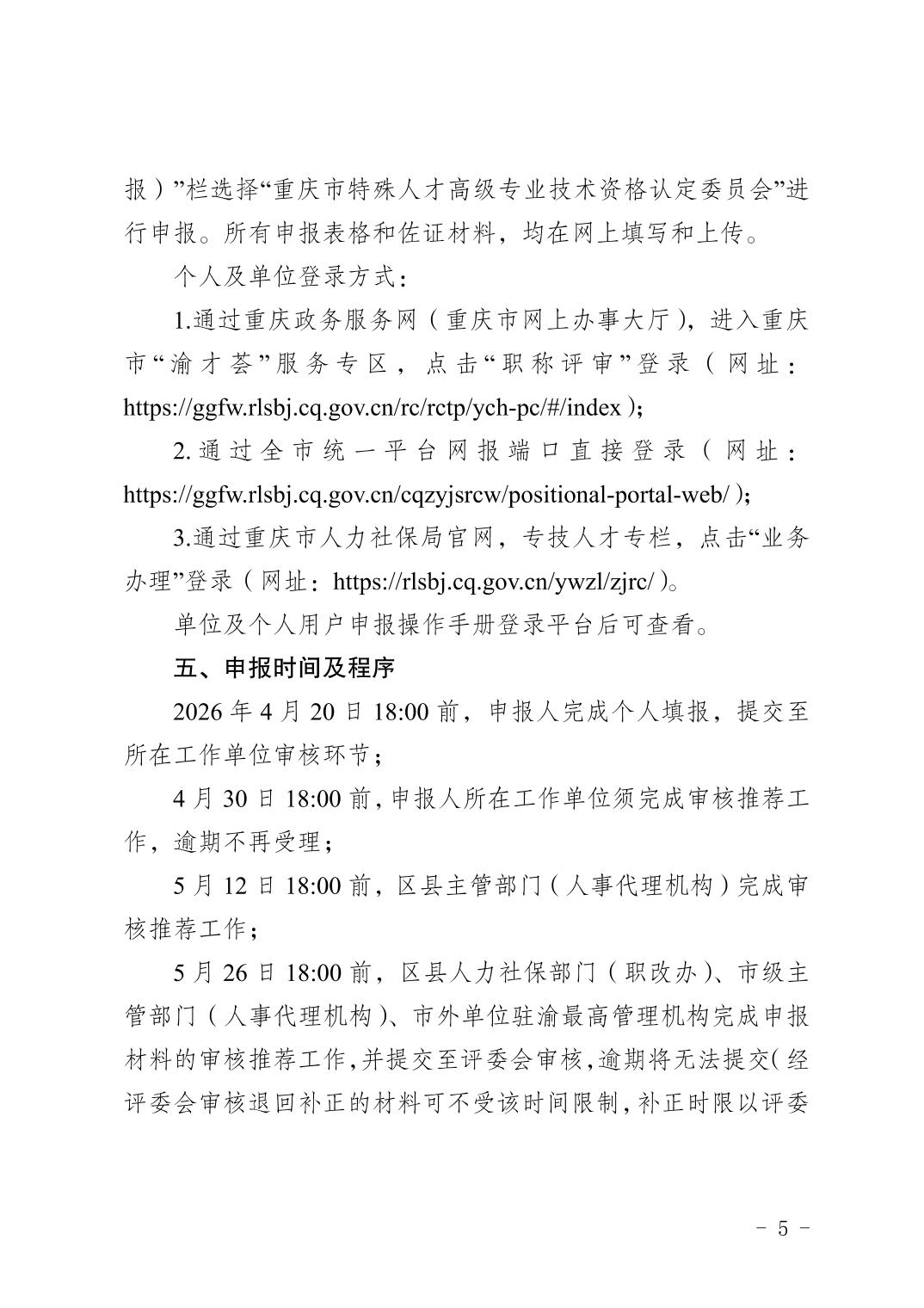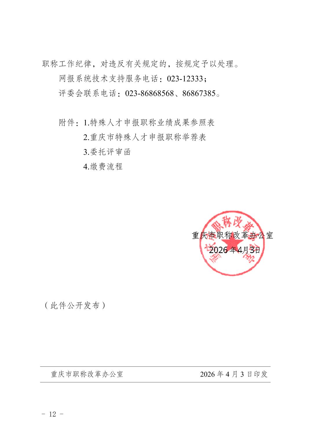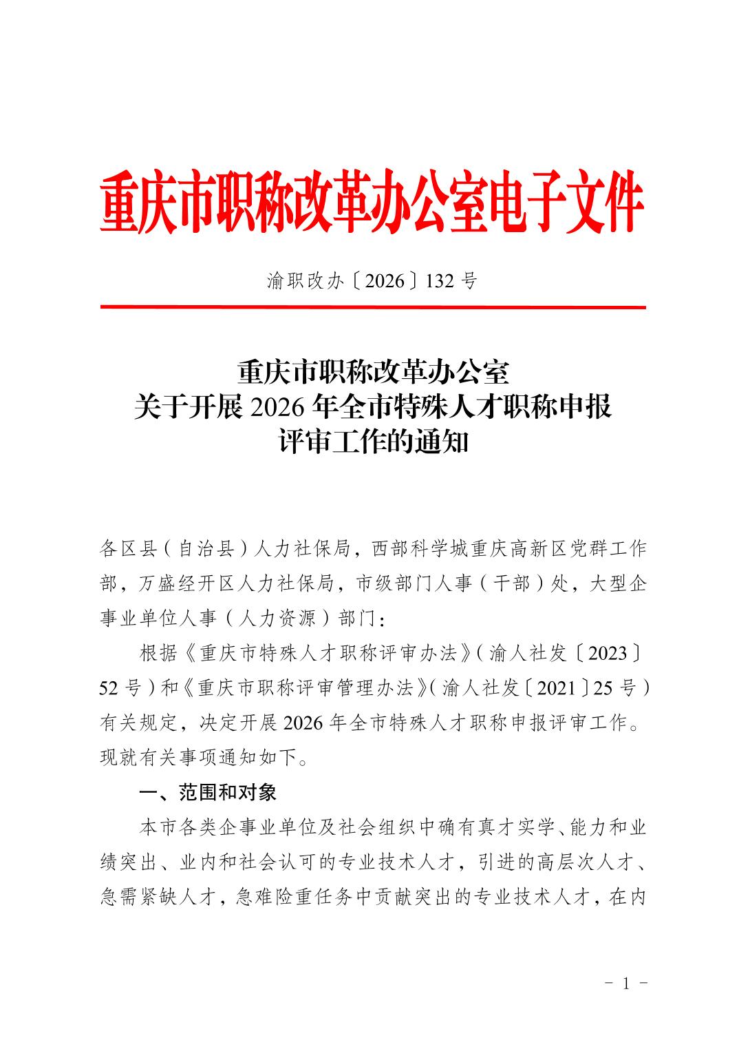 现将重庆市职称改革办公室《关于开展2026年全市特殊人才职称申报评审工作的通知》(渝职改办〔2026〕132号)转发给你们,请按照文件要求,组织符合条件的专业技术人员按照规定的时间及程序登录重庆市专业技术人员服务平台进行申报。