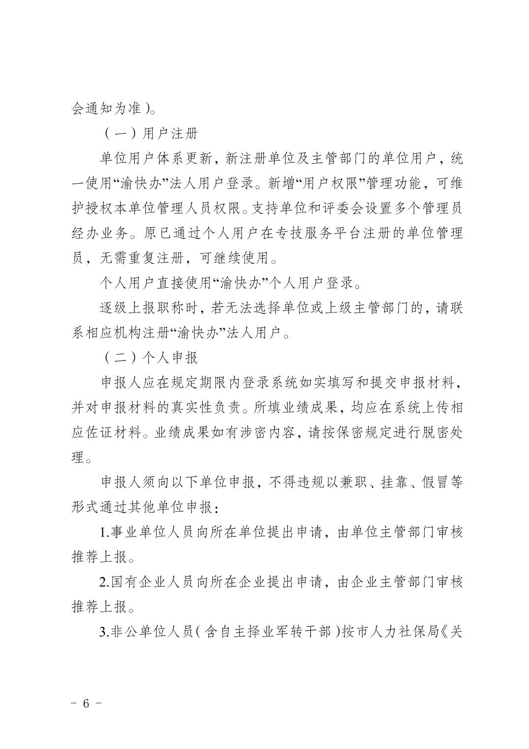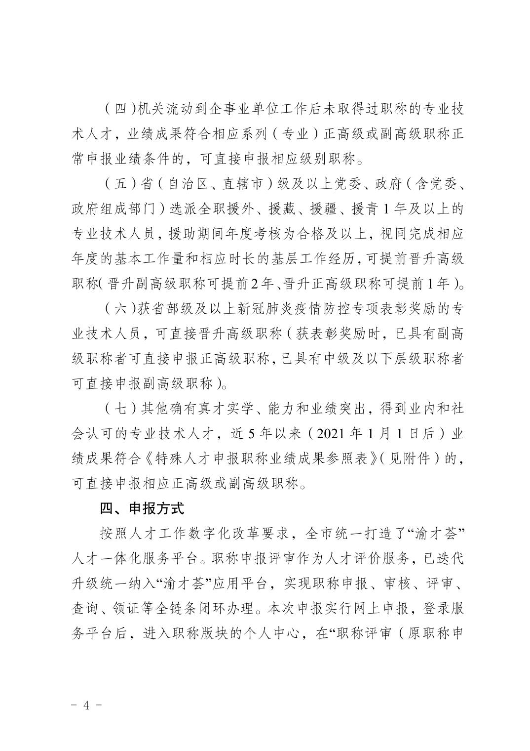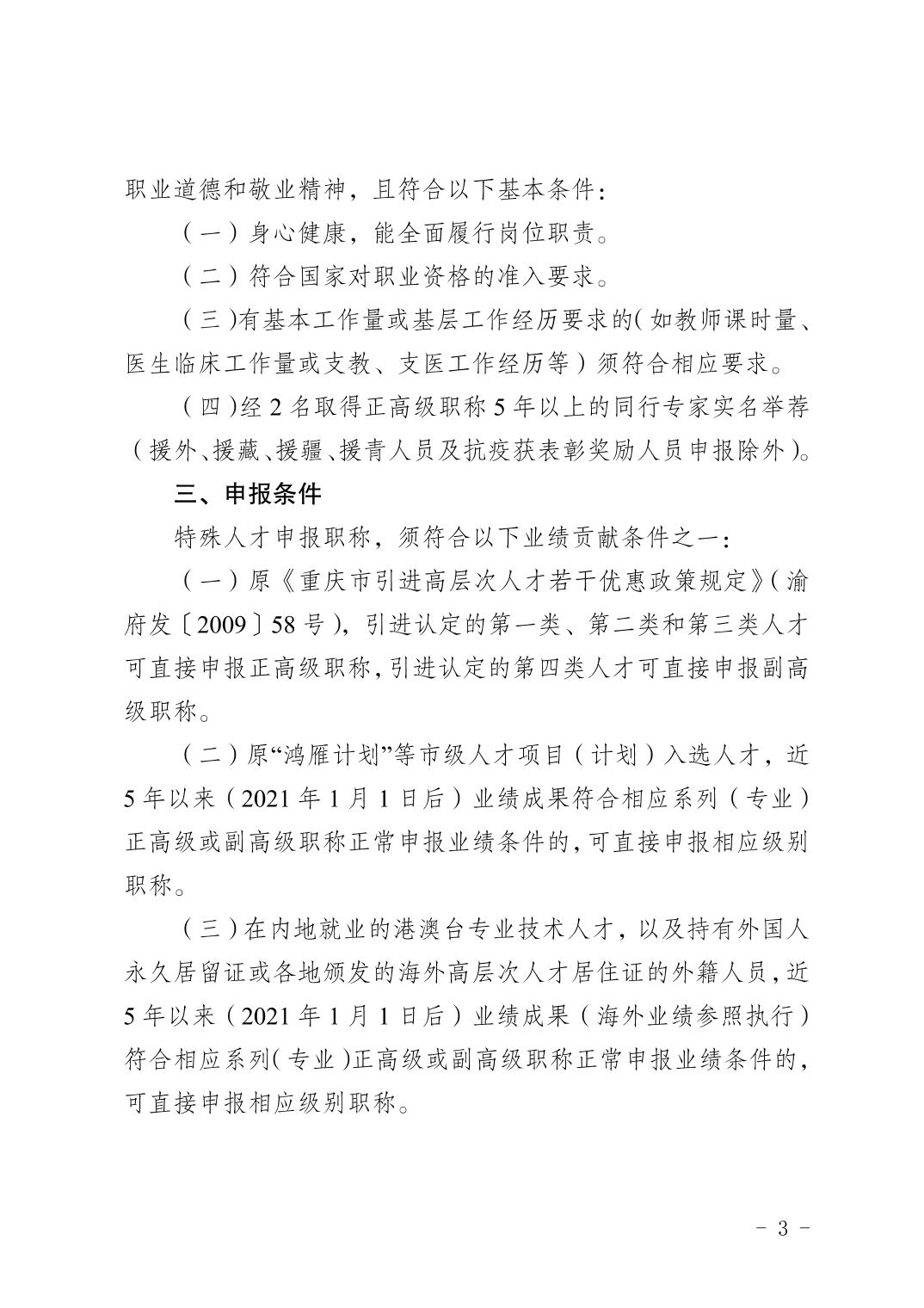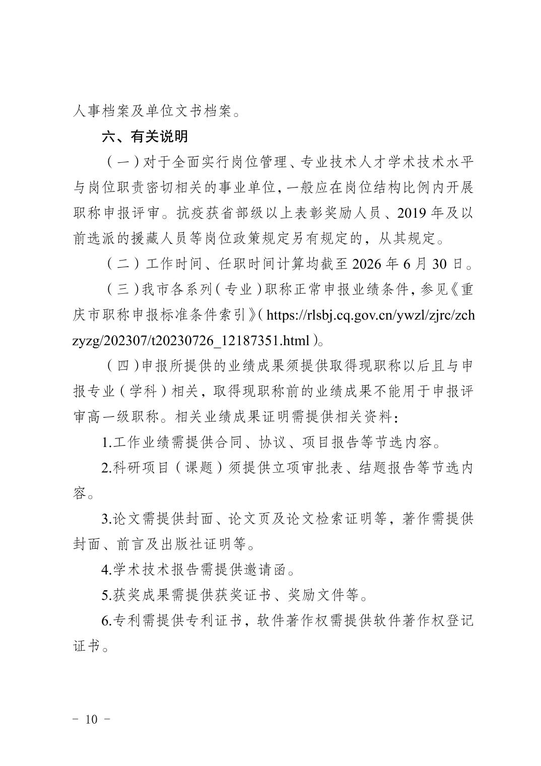 现将重庆市职称改革办公室《关于开展2026年全市特殊人才职称申报评审工作的通知》(渝职改办〔2026〕132号)转发给你们,请按照文件要求,组织符合条件的专业技术人员按照规定的时间及程序登录重庆市专业技术人员服务平台进行申报。