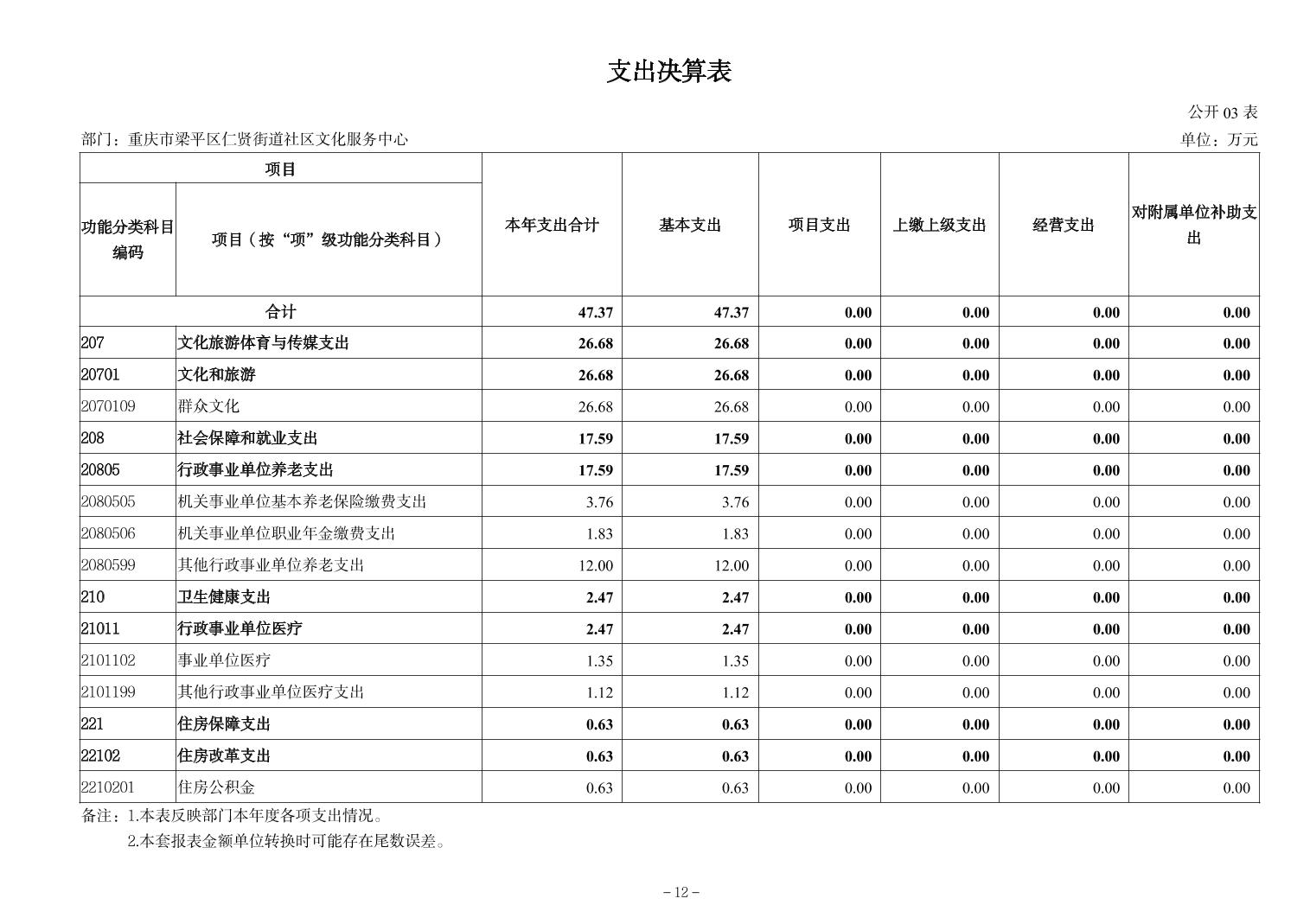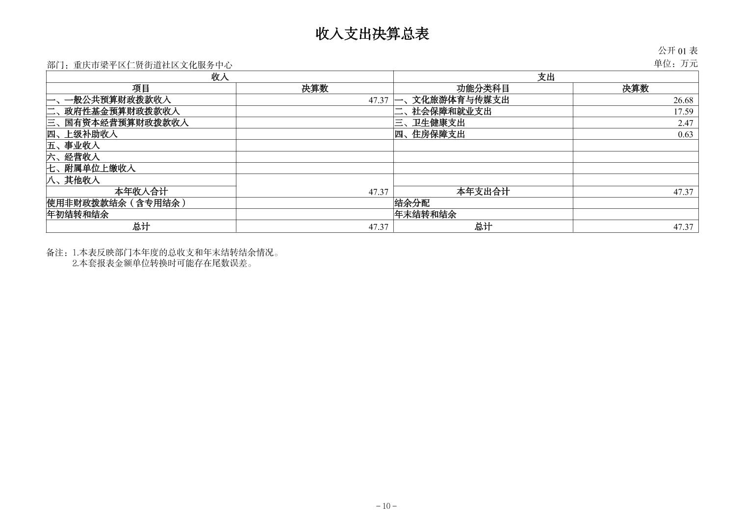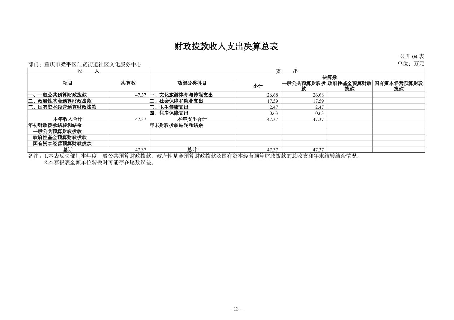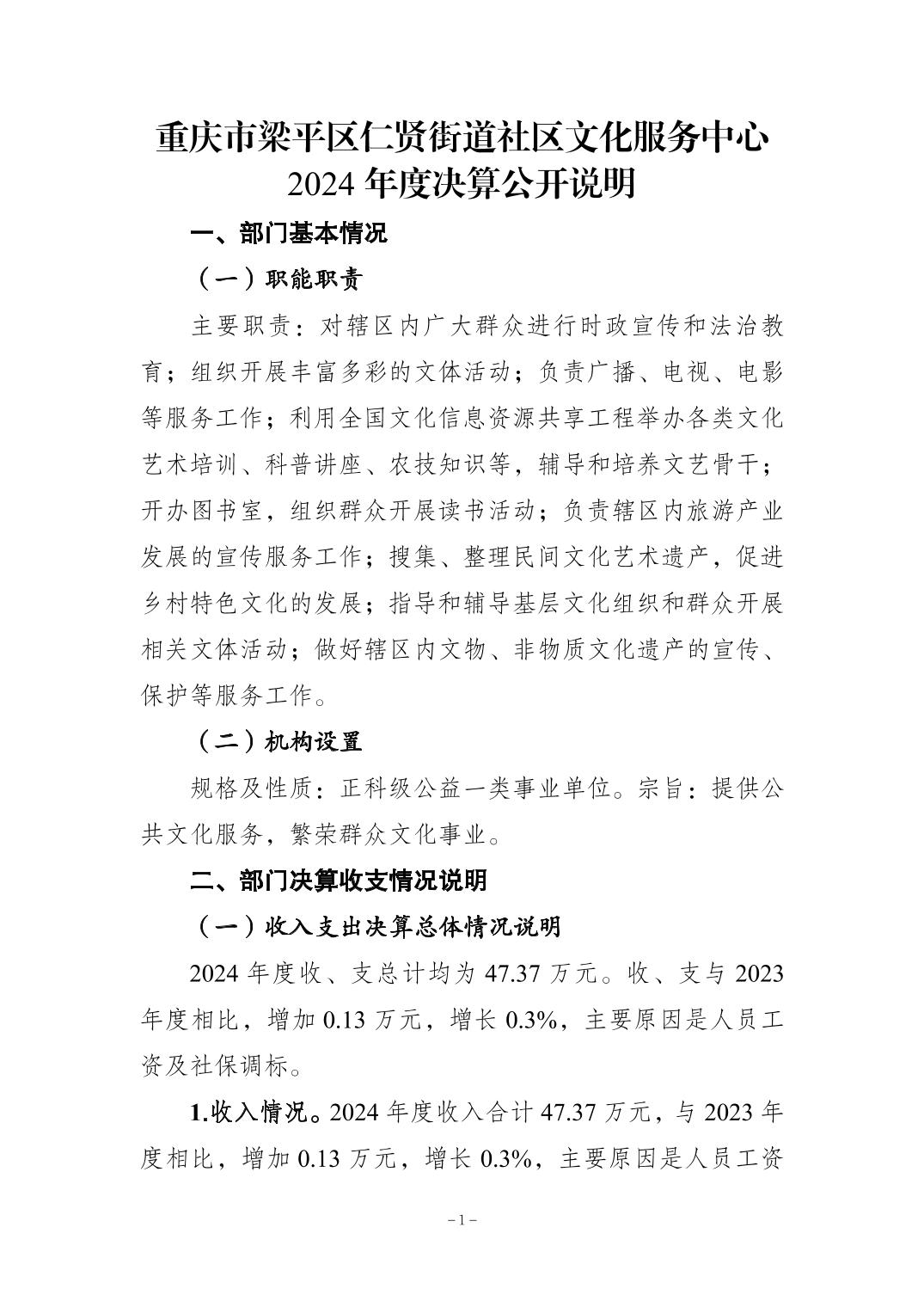 | 标题 | 重庆市梁平区仁贤街道社区文化服务中心2024年决算公开说明及公开报表 |