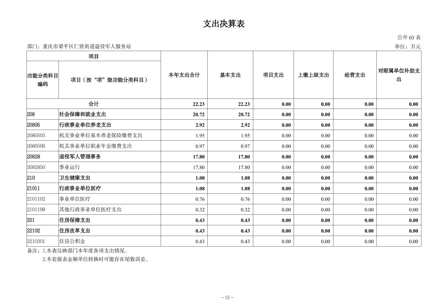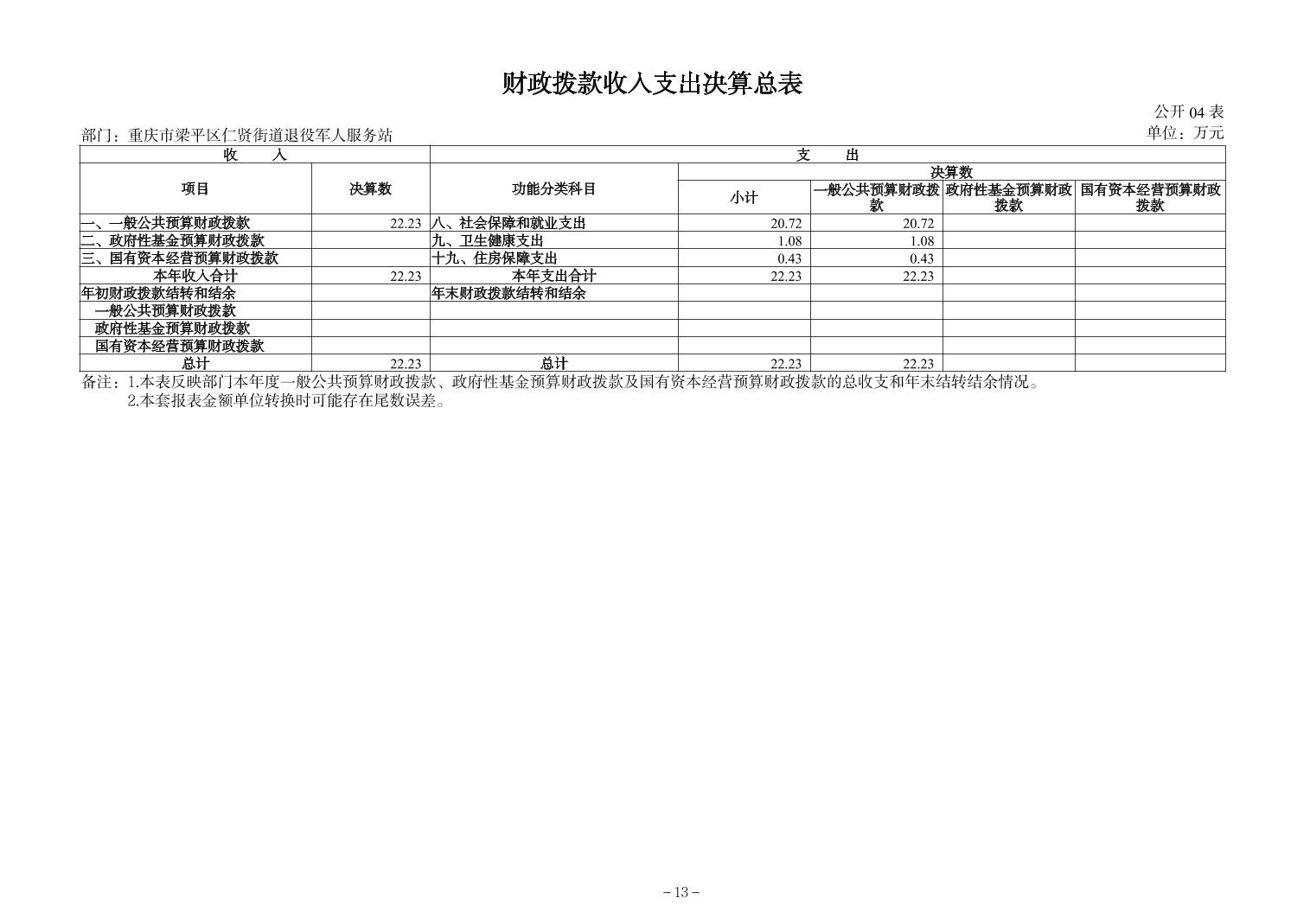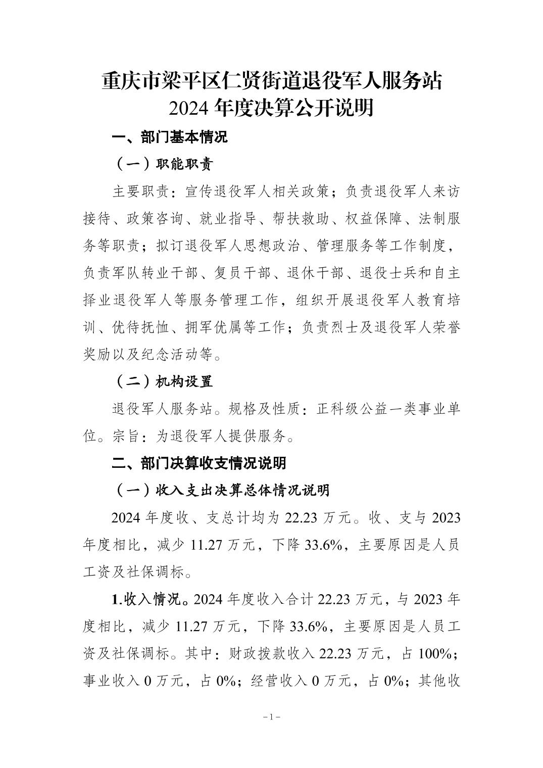 | 标题 | 重庆市梁平区仁贤街道退役军人服务站2024年决算公开说明及公开报表 |