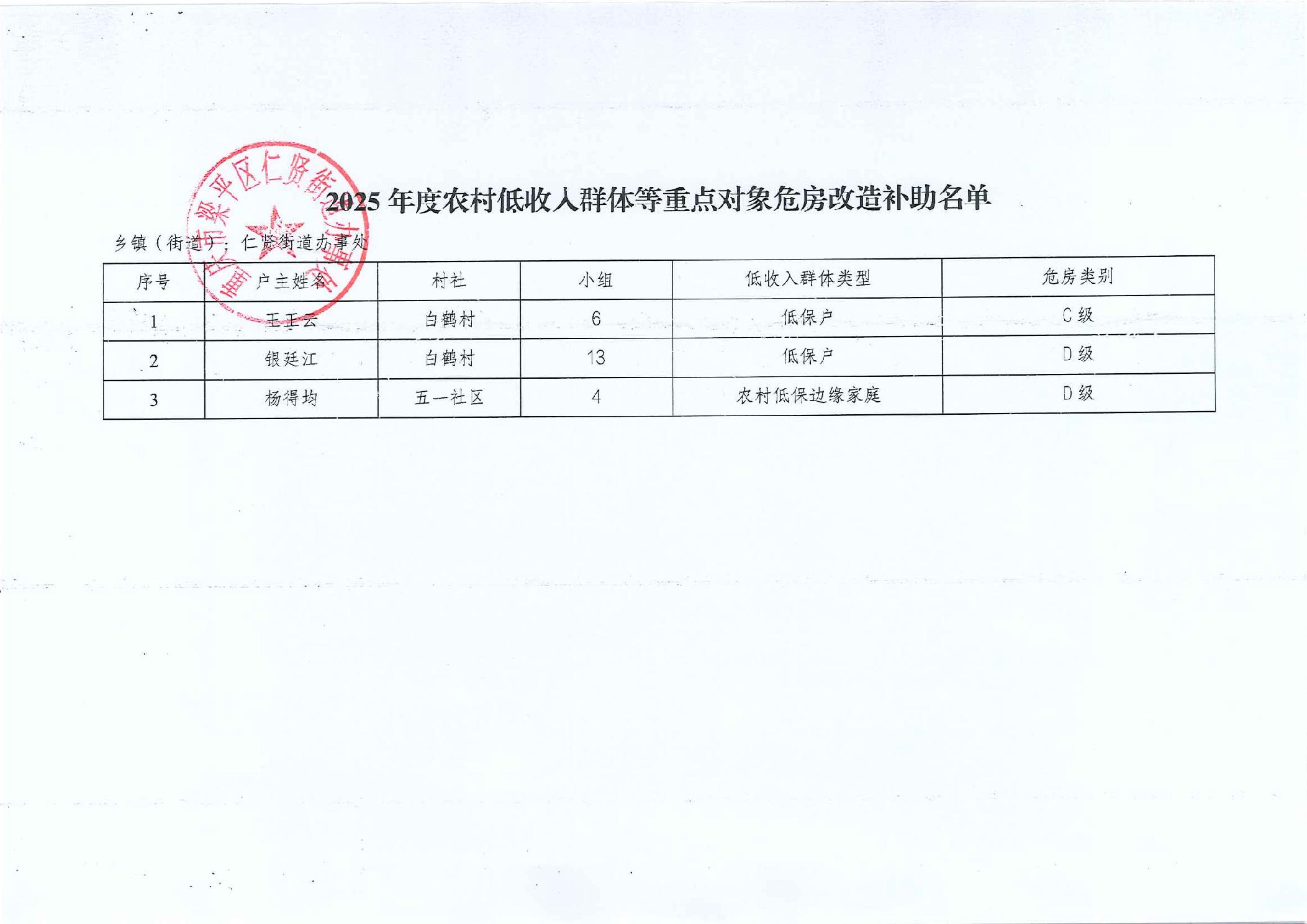 | 标题 | 2025年仁贤街道农村危房改造对象审核结果公示 |