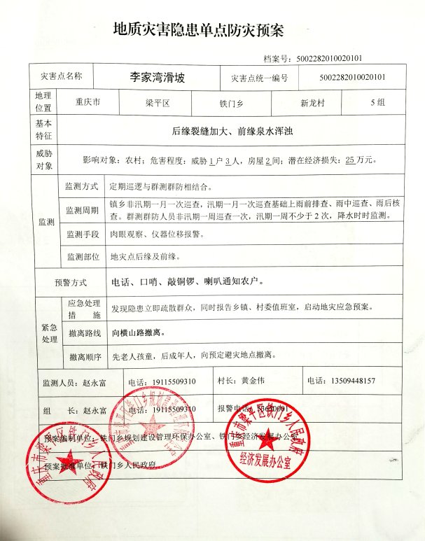 新龙村5组李家湾滑坡重点防治区域应急处置明确事项