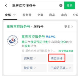 第一个登录入口,“重庆疾控服务号”。微信搜索“重庆疾控服务号”小程序,点击“预防接种”;