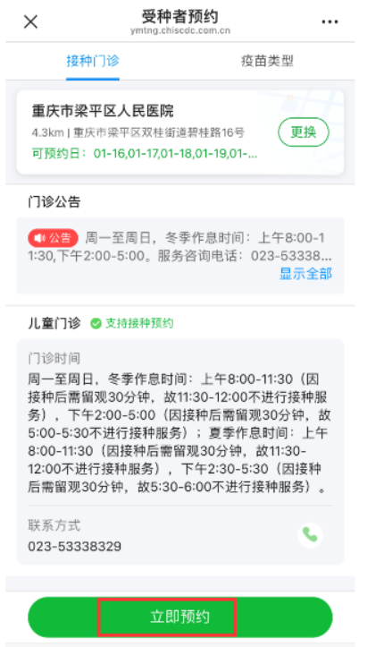 更换接种门诊后,点击“立即预约”。