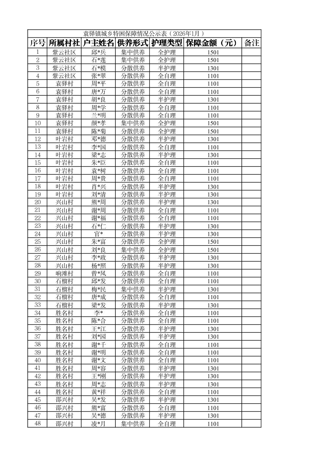 | 标题 | 袁驿镇城乡特困保障情况公示表(2026年1月) |