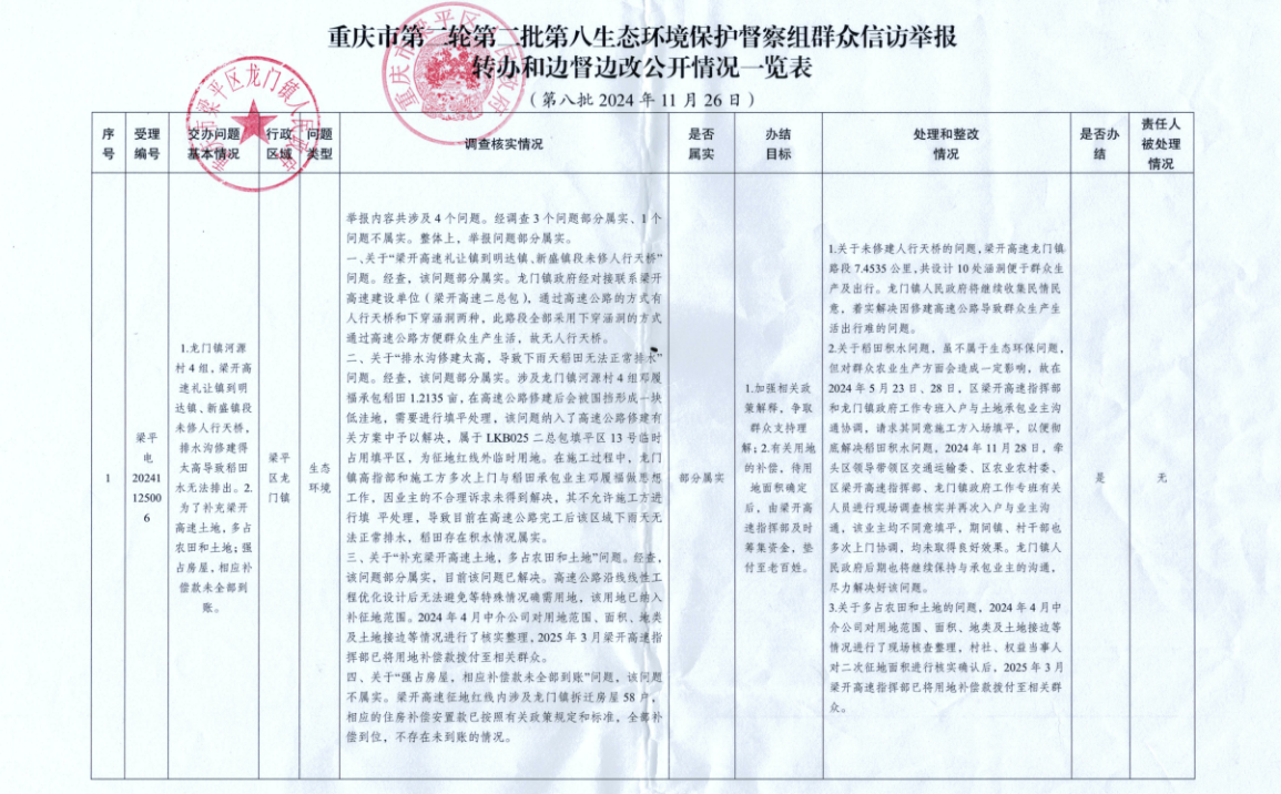 重庆市第二轮第二批第八生态环境保护督察组群众信访举报转办和边督边改公开情况一览表(第八批)
